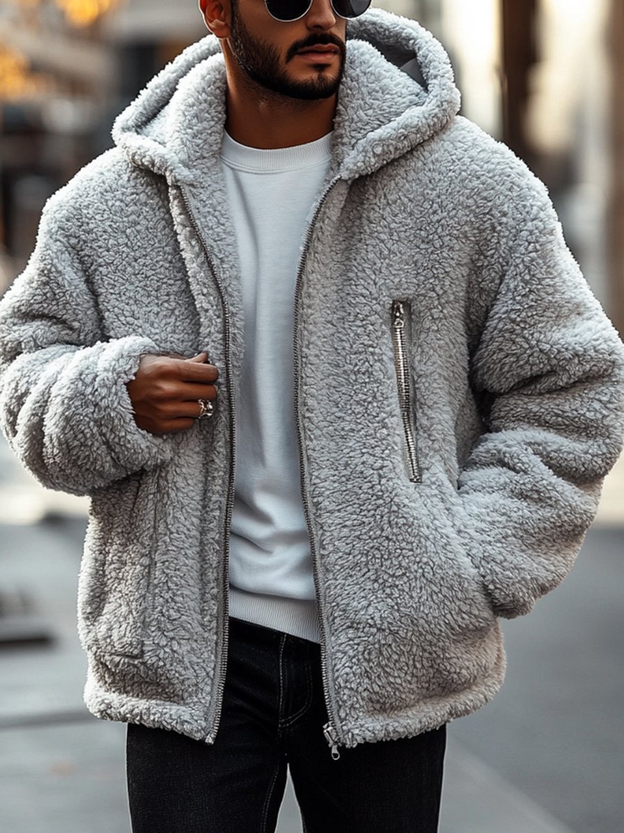 Men's Fashionable Open Pocket Button Design Imitation Leather Velvet Clip Plush Warm Letter Design Jacket
