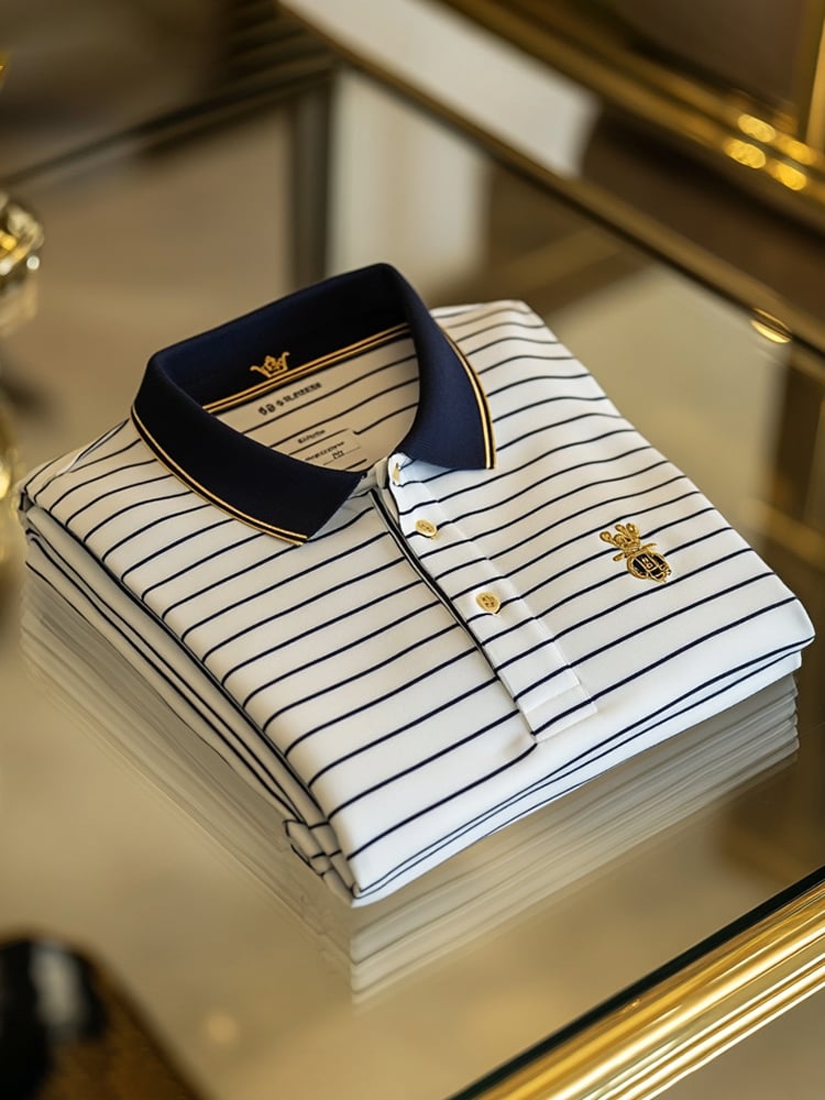 Men's Business Blue and White Striped Fashion Sweat-wicking Short Sleeve Polo Shirt