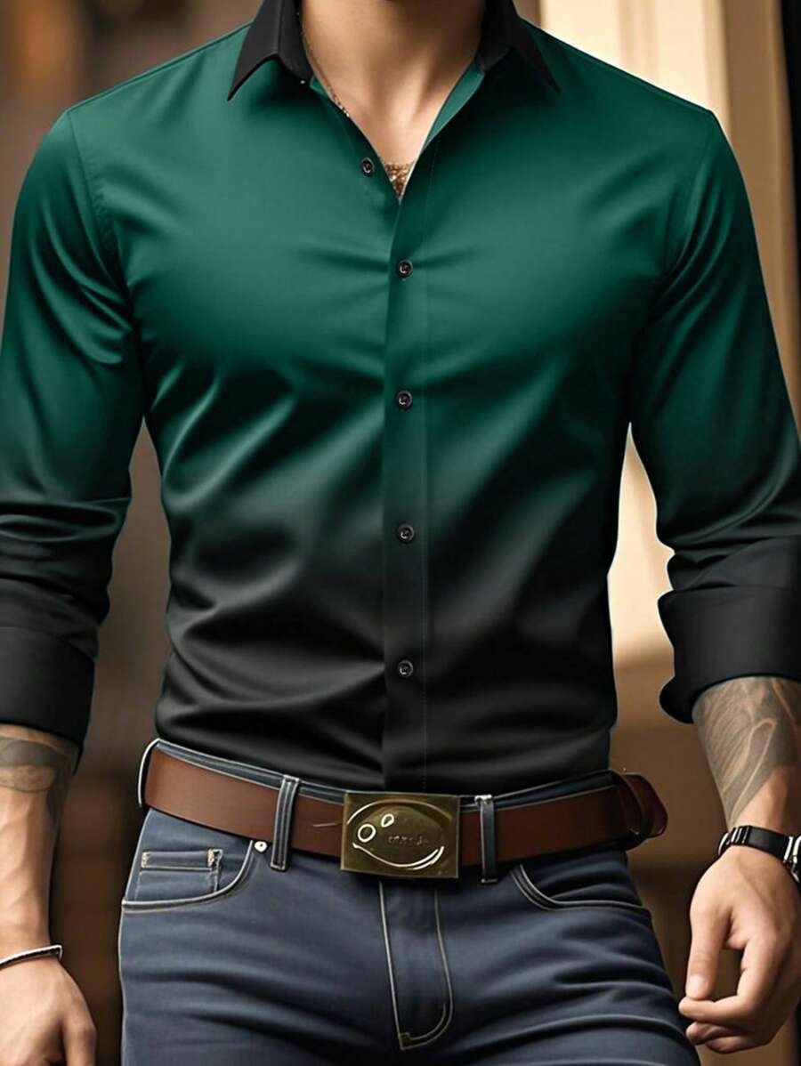 Men's Business With Contrasting Color Design And Printed Pockets Casual Long-Sleeved Shirt