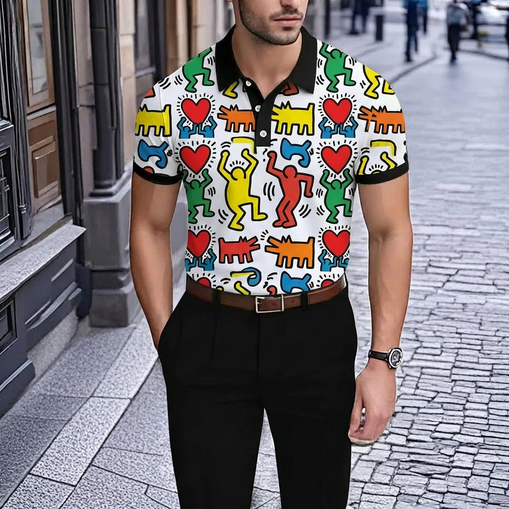 Men's Casual Colorful Character Print Short-Sleeve Polo Shirt