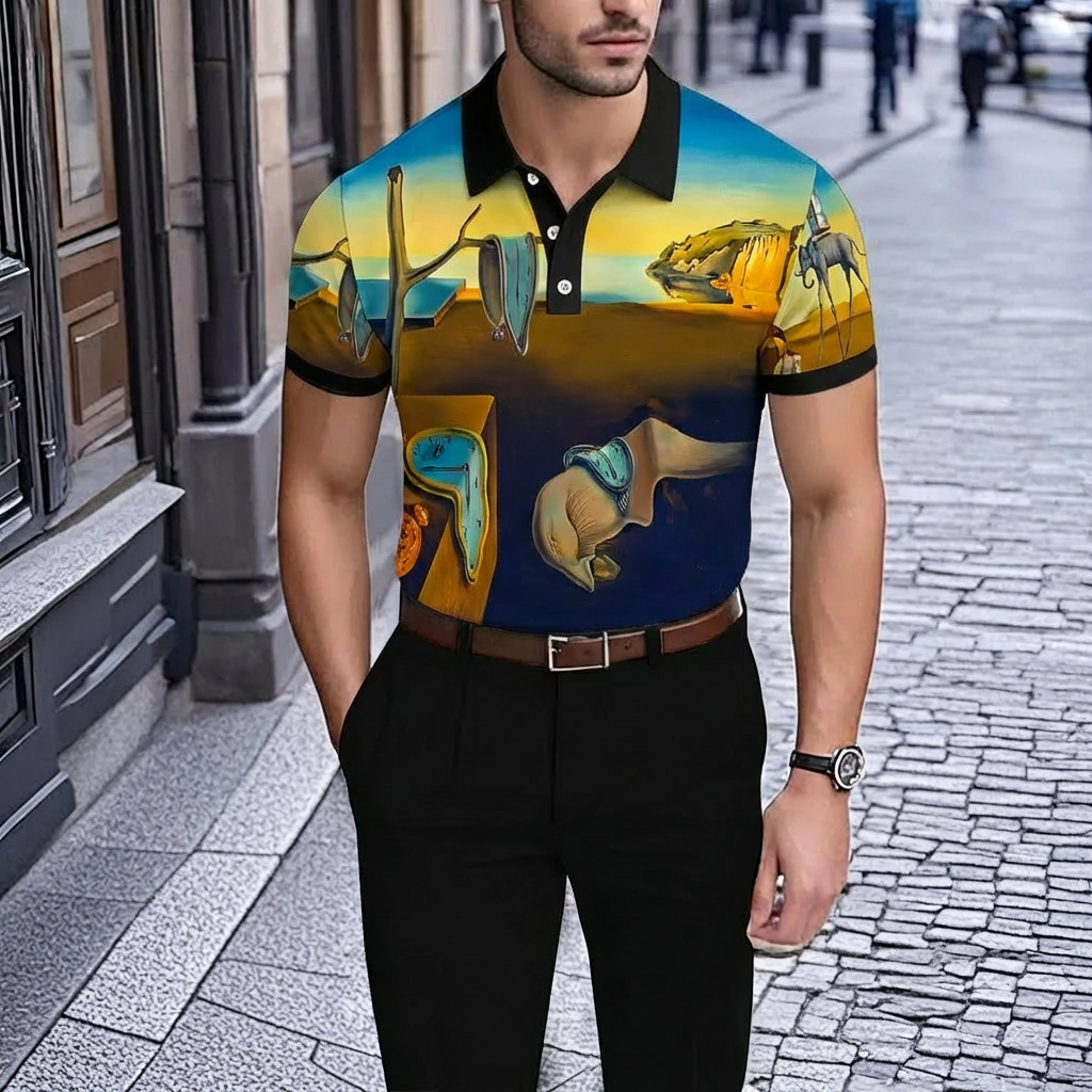 Men's Retro Blue Oil Painting Print Short-Sleeve Polo Shirt