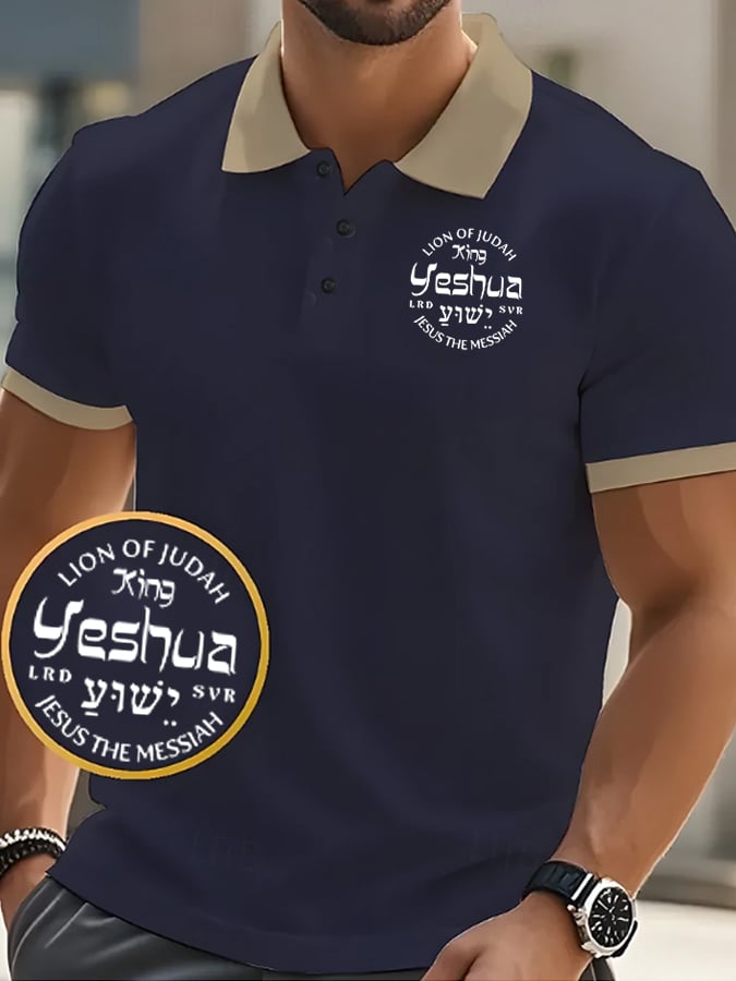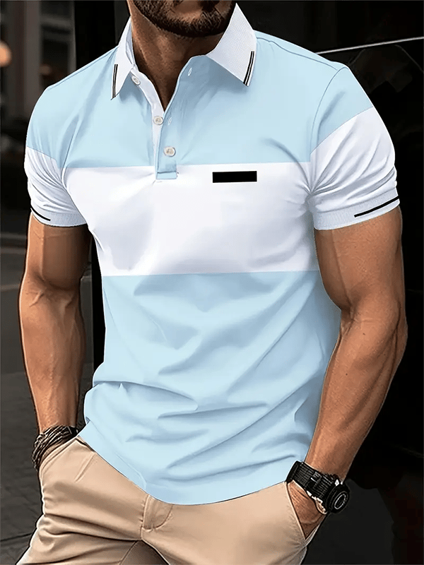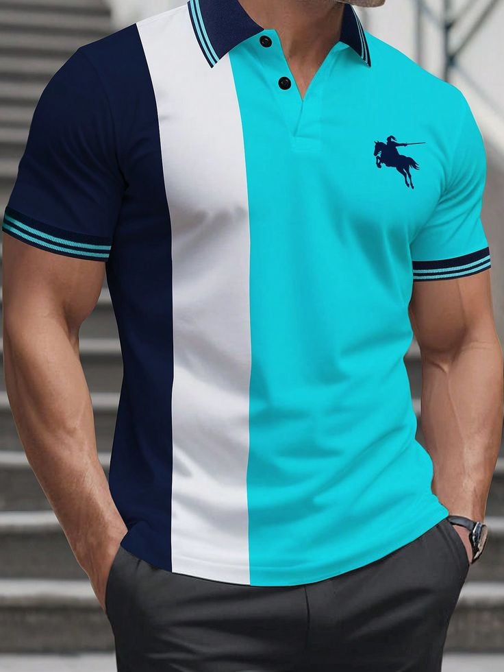 Men's Business Color-Blocked Logo Button-Down Short Sleeve Polo Shirt