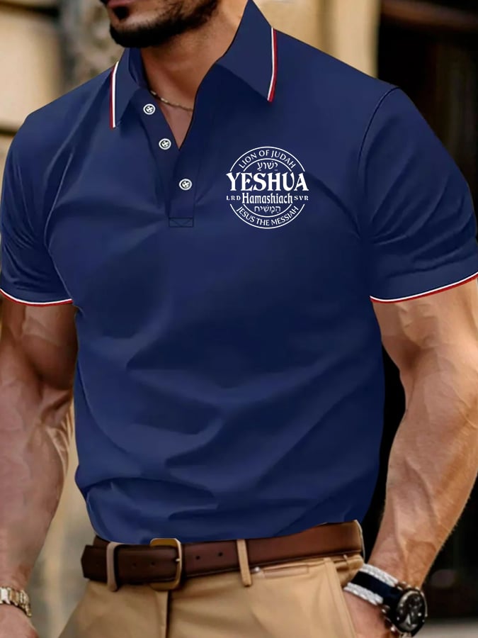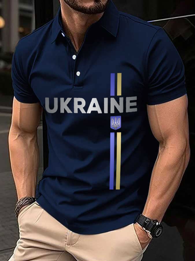 Men's Business Stripe Logo Button-Down Short Sleeve Polo Shirt