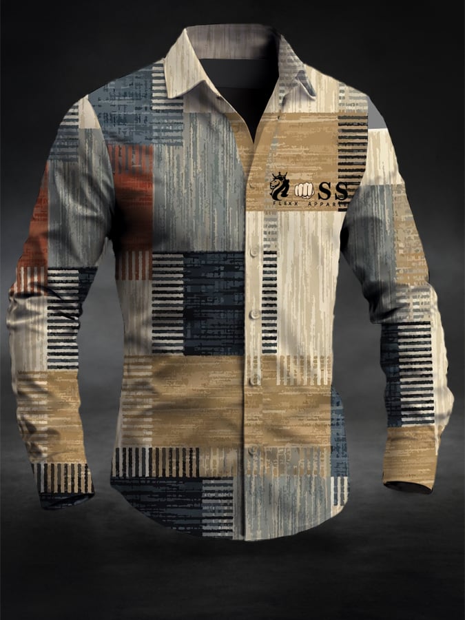Men'S Vintage Color-Block Printed Long-Sleeved Shirt