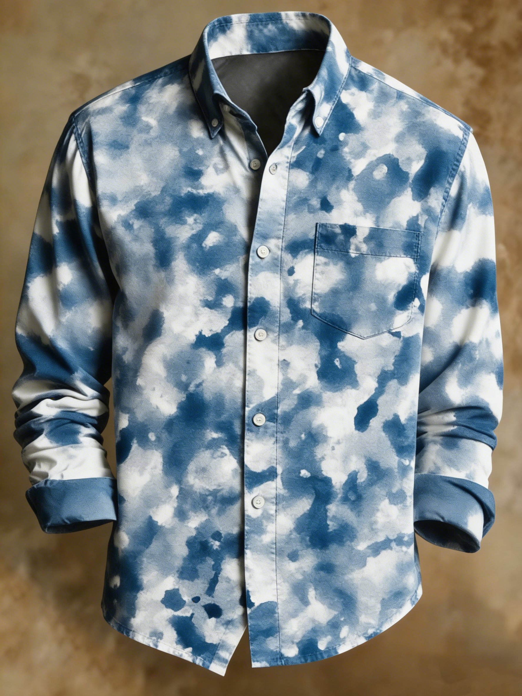 Retro Blue Tie-Dye Shirt Men's Casual Business Oxford Long Sleeve Shirt