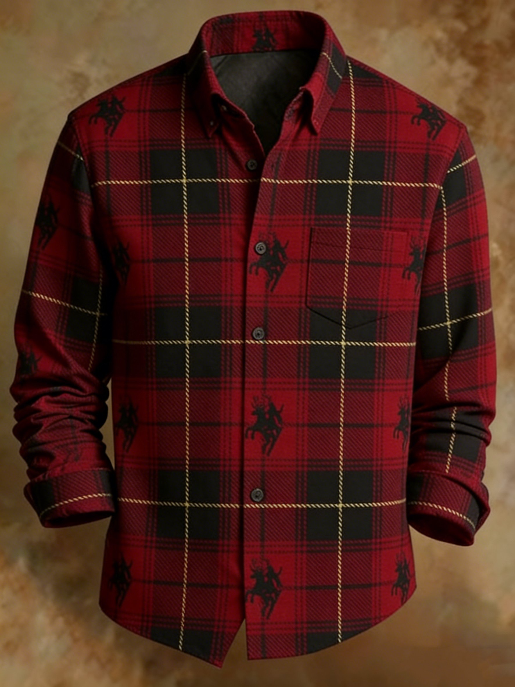 Men's Classic Tartan Plaid Shirt Red Black with Polo Equestrian Print Retro Button-Up Shirt