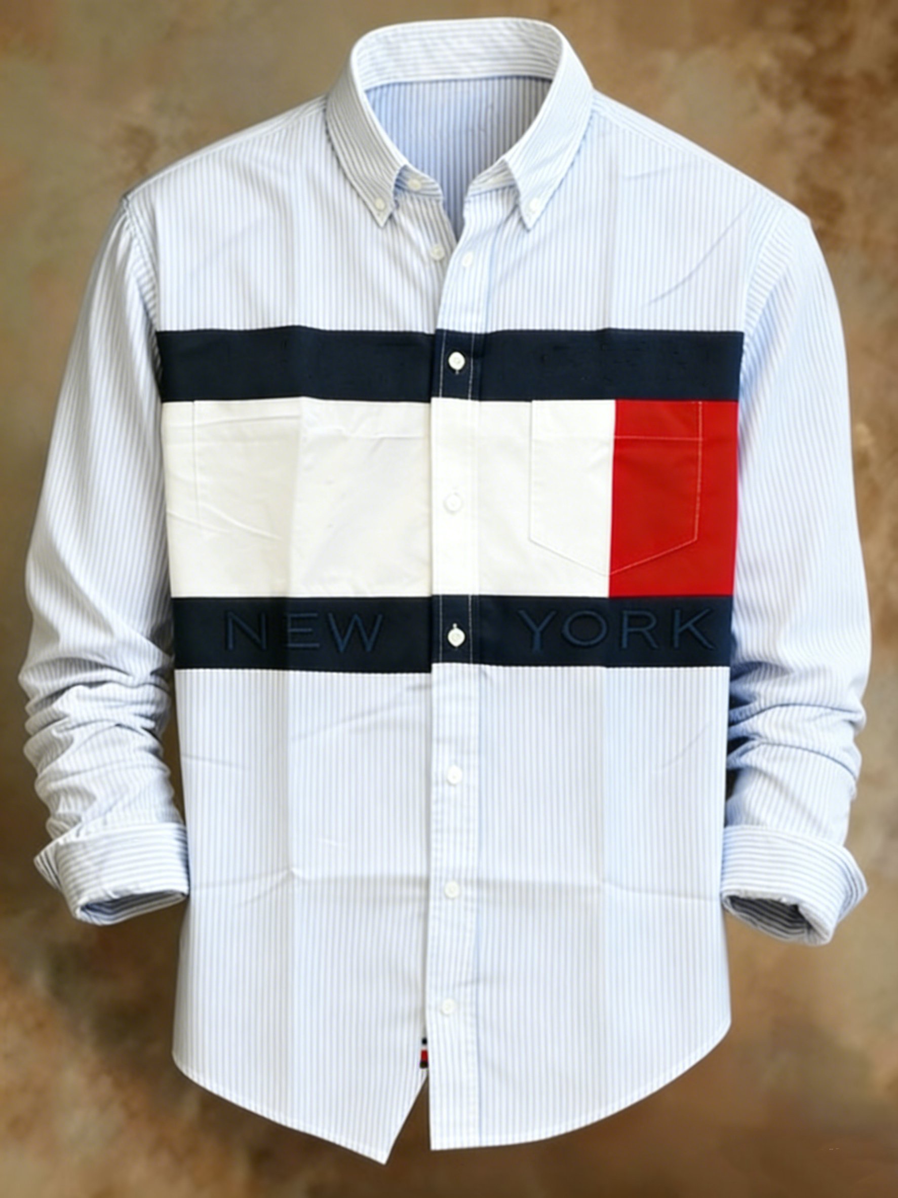 Vintage Style Navy Red Striped Shirt Men's Long Sleeve Casual Business Top