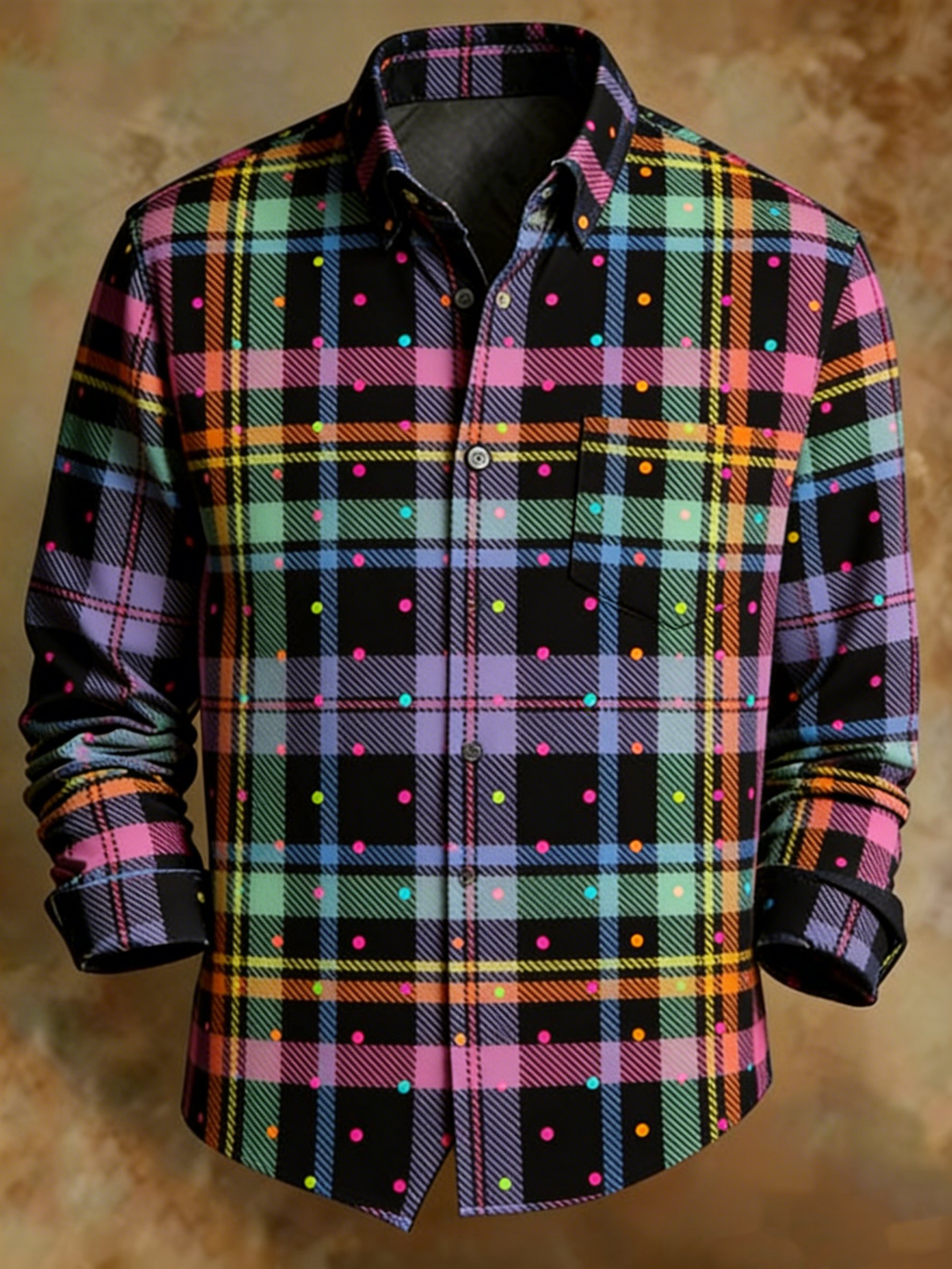 Retro Neon Polka Dot Plaid Shirt Men's Black Multicolor Grid Button-Up Casual Shirt