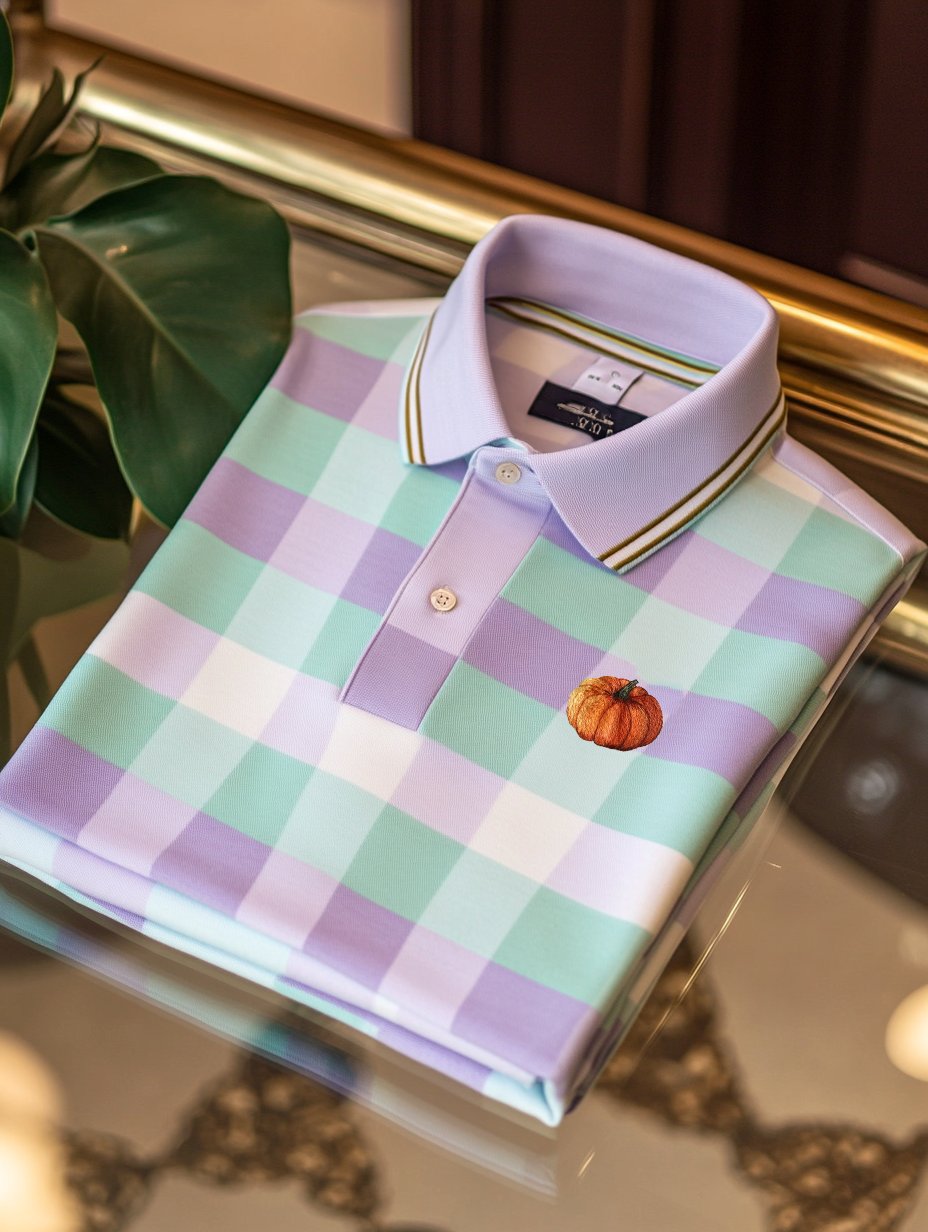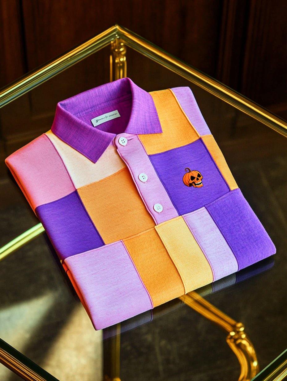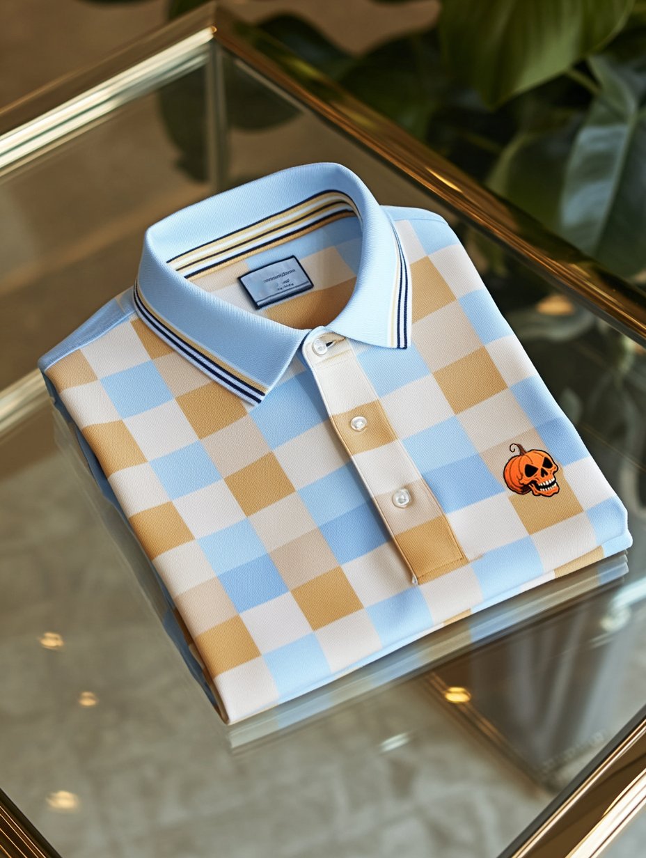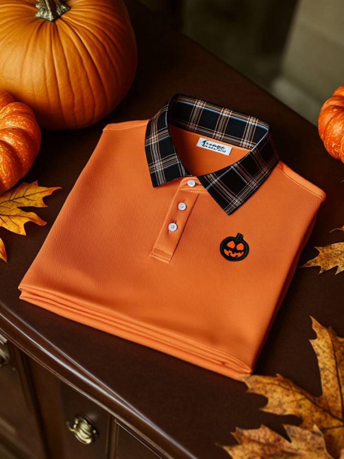 Men's Classic Business Check Halloween Pumpkin Logo Button Short Sleeve Polo Shirt