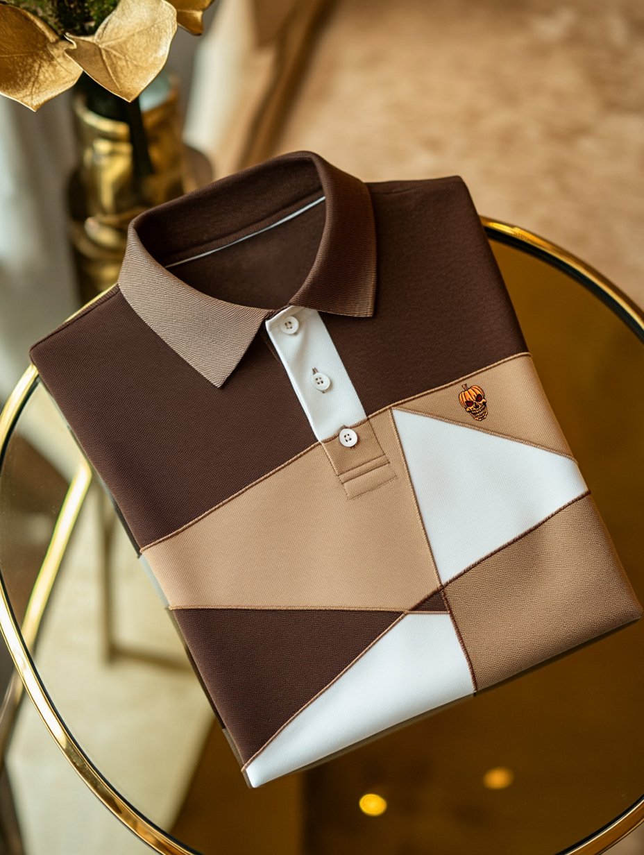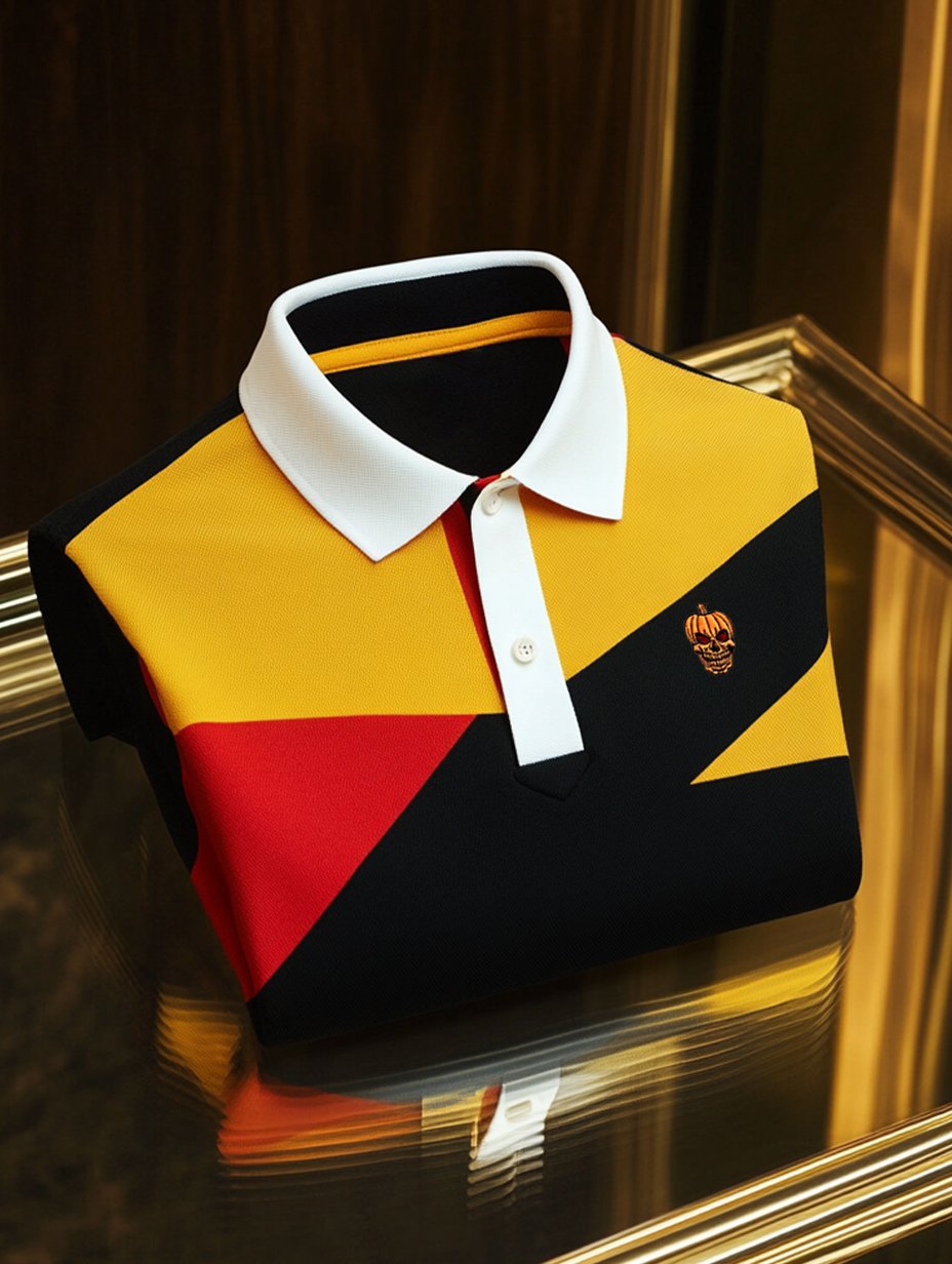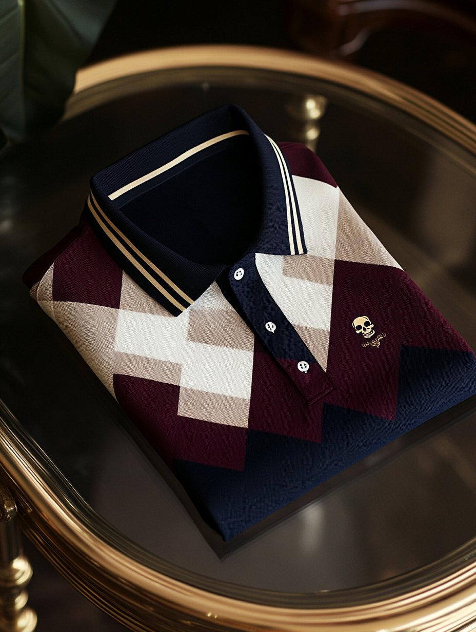 Men's Classic Business Check Halloween Skull Logo Button Short Sleeve Polo Shirt