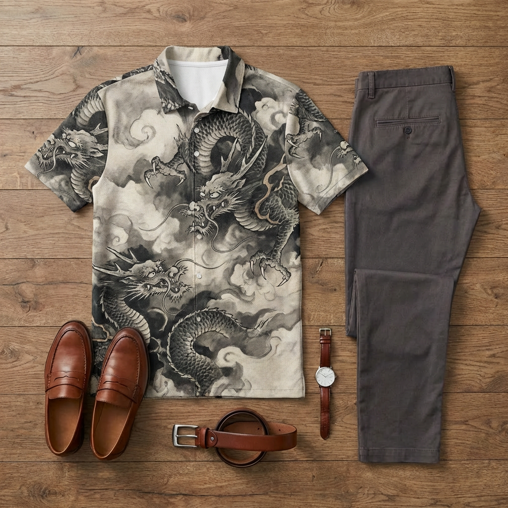 Men's Casual Brown Dragon Printed Short-Sleeve Polo Shirt And Trousers Two-Piece Set