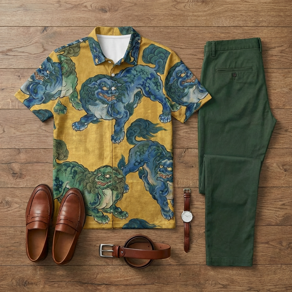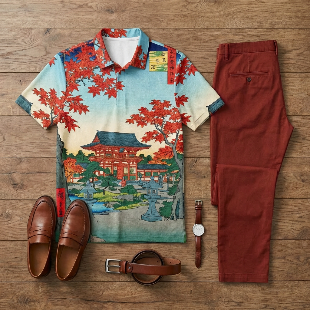 Men's Casual Japanese Cuban Style Printed Short-Sleeve Polo Shirt And Trousers Two-Piece Set