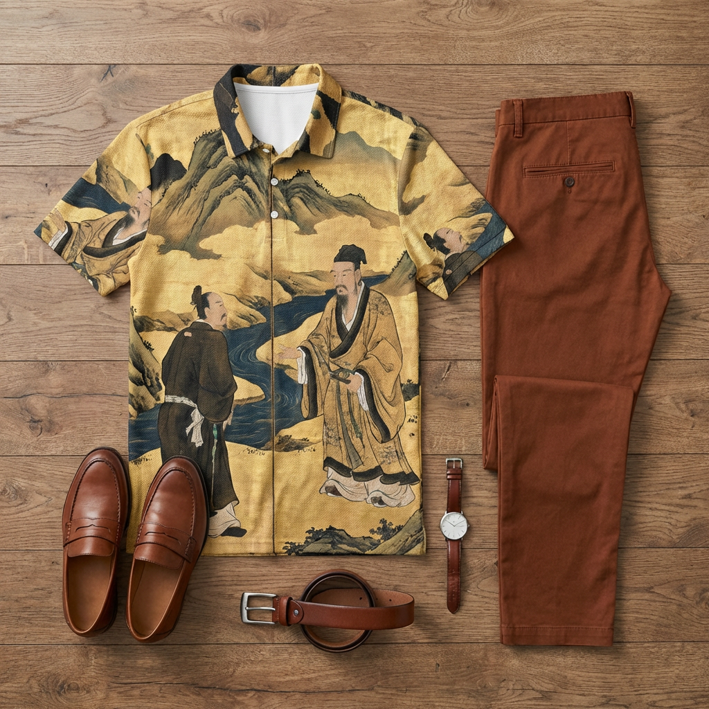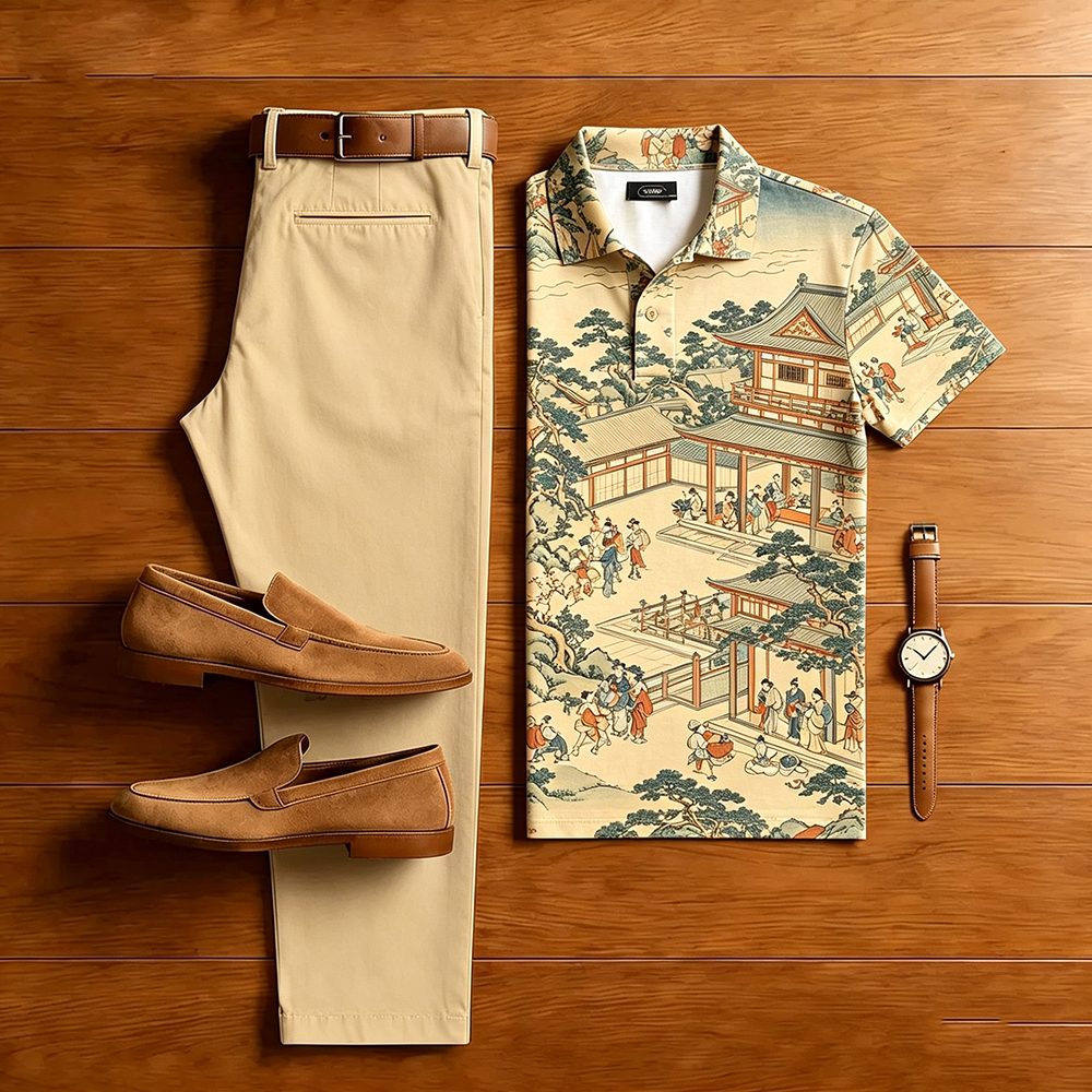 Men's Casual Apricot-Colored Scenery Printed Short-Sleeve Polo Shirt And Trousers Two-Piece Set