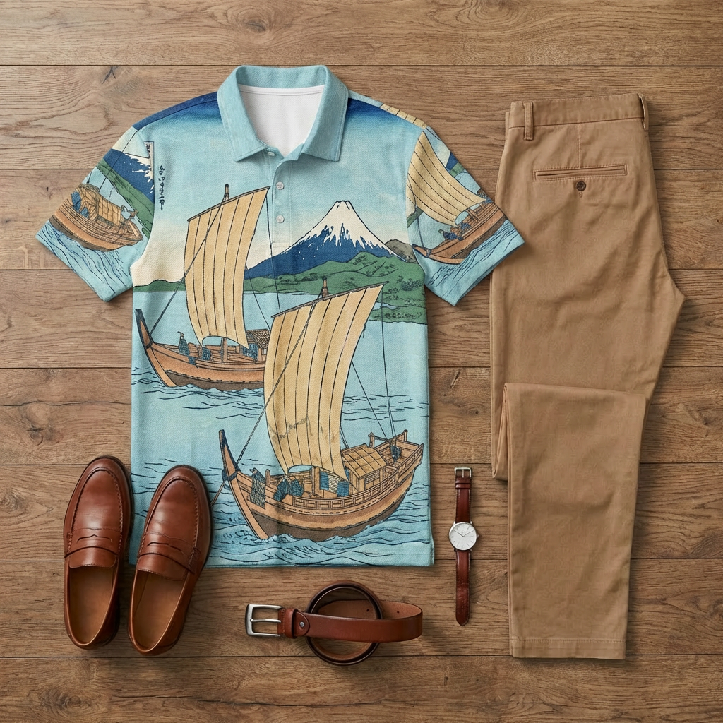 Men's Casual Blue Sailboat Printed Short-Sleeve Polo Shirt And Trousers Two-Piece Set