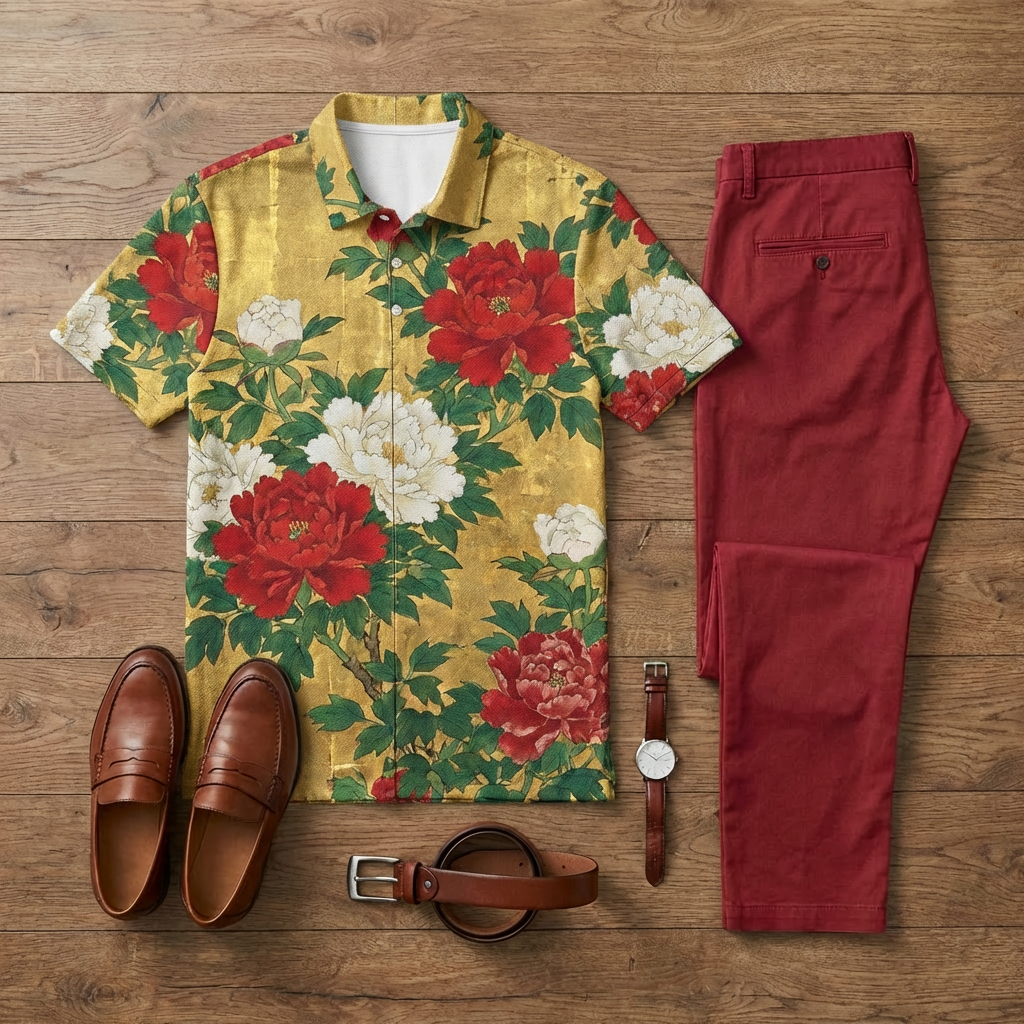 Men's Casual Apricot Flowers Printed Short-Sleeve Polo Shirt And Trousers Two-Piece Set