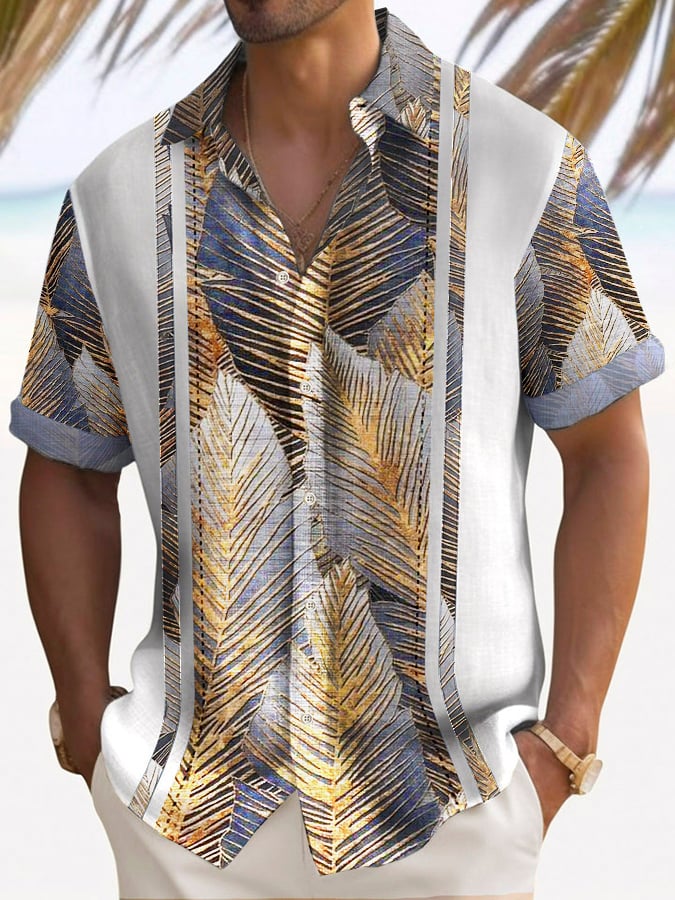 Men's Hawaiian Leaf Print Short Sleeve Pockets Shirt