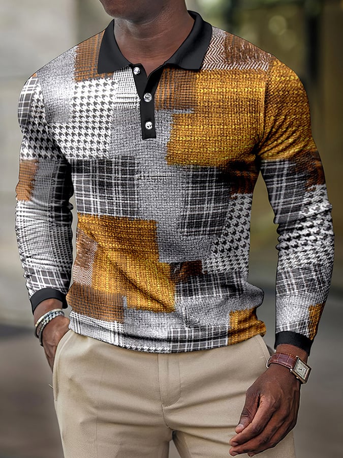 Colorblocked Plaid Casual Waffle Long Sleeved Men'S Polo Shirt
