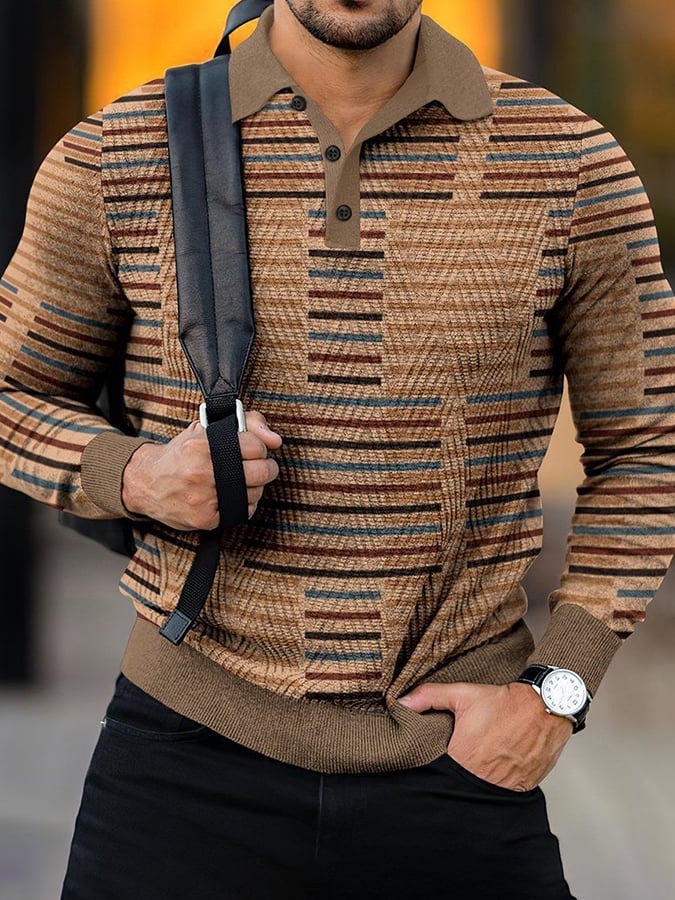 Men's Retro Business Stripe Print Long Sleeve POLO Shirt