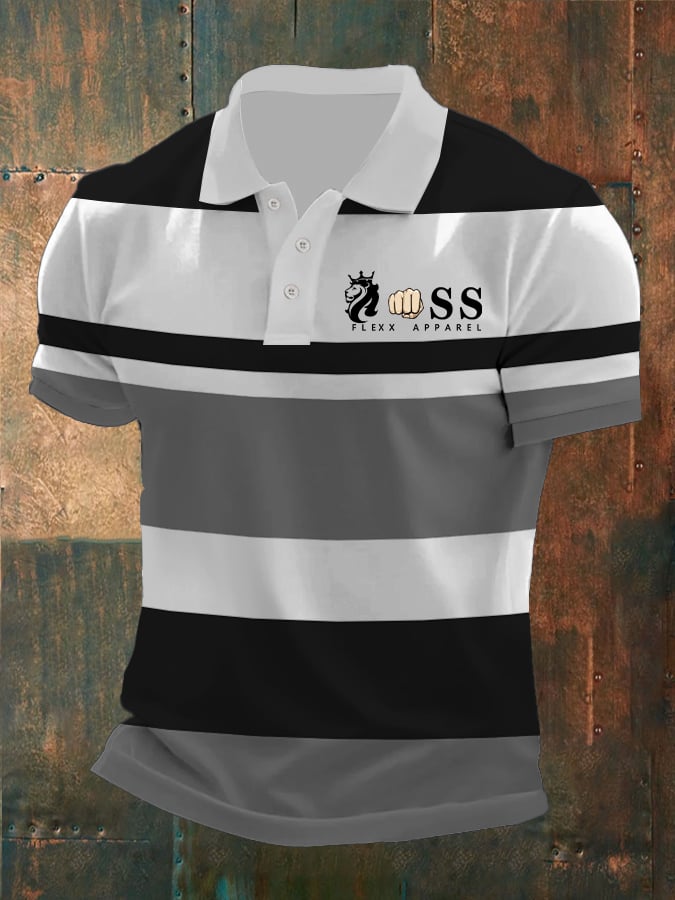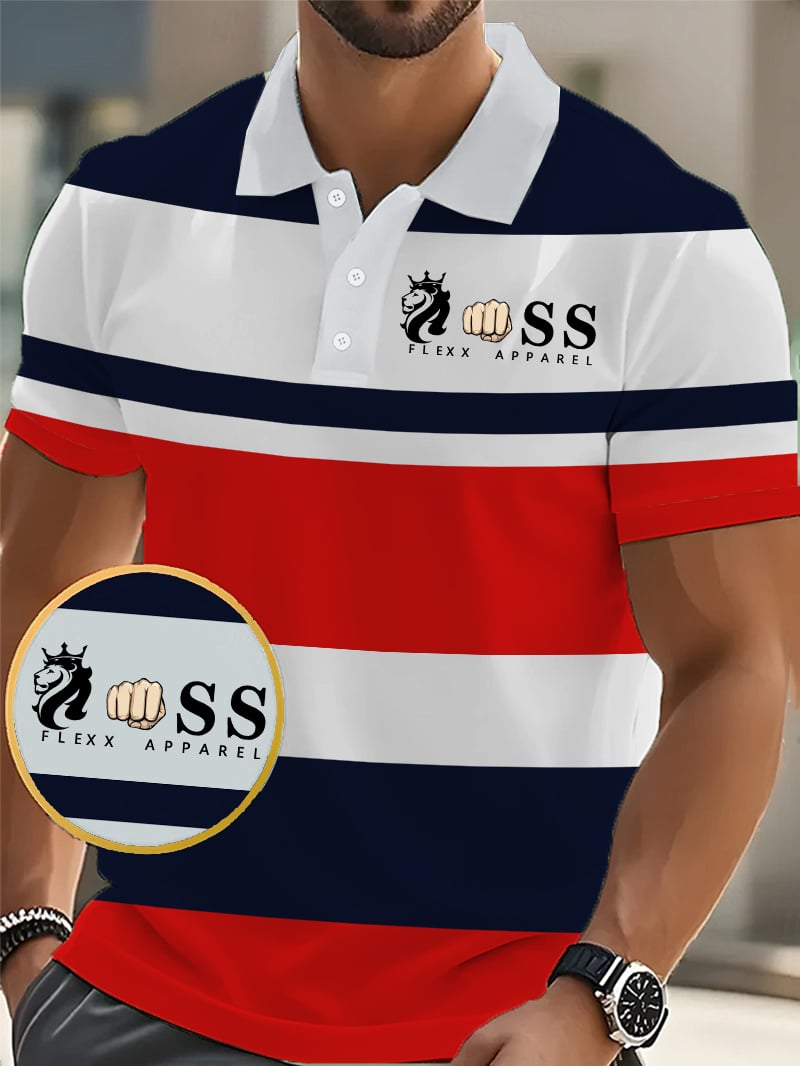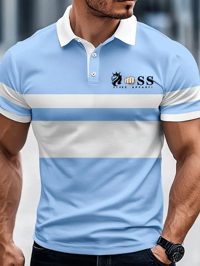 Men's Business Stripe Logo Button-Down Short Sleeve Polo Shirt