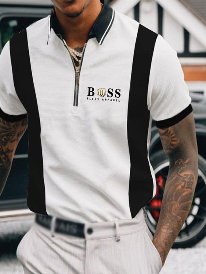 Color-Block Geometric Print Lapel Zipper Pullover Casual Polo Shirt