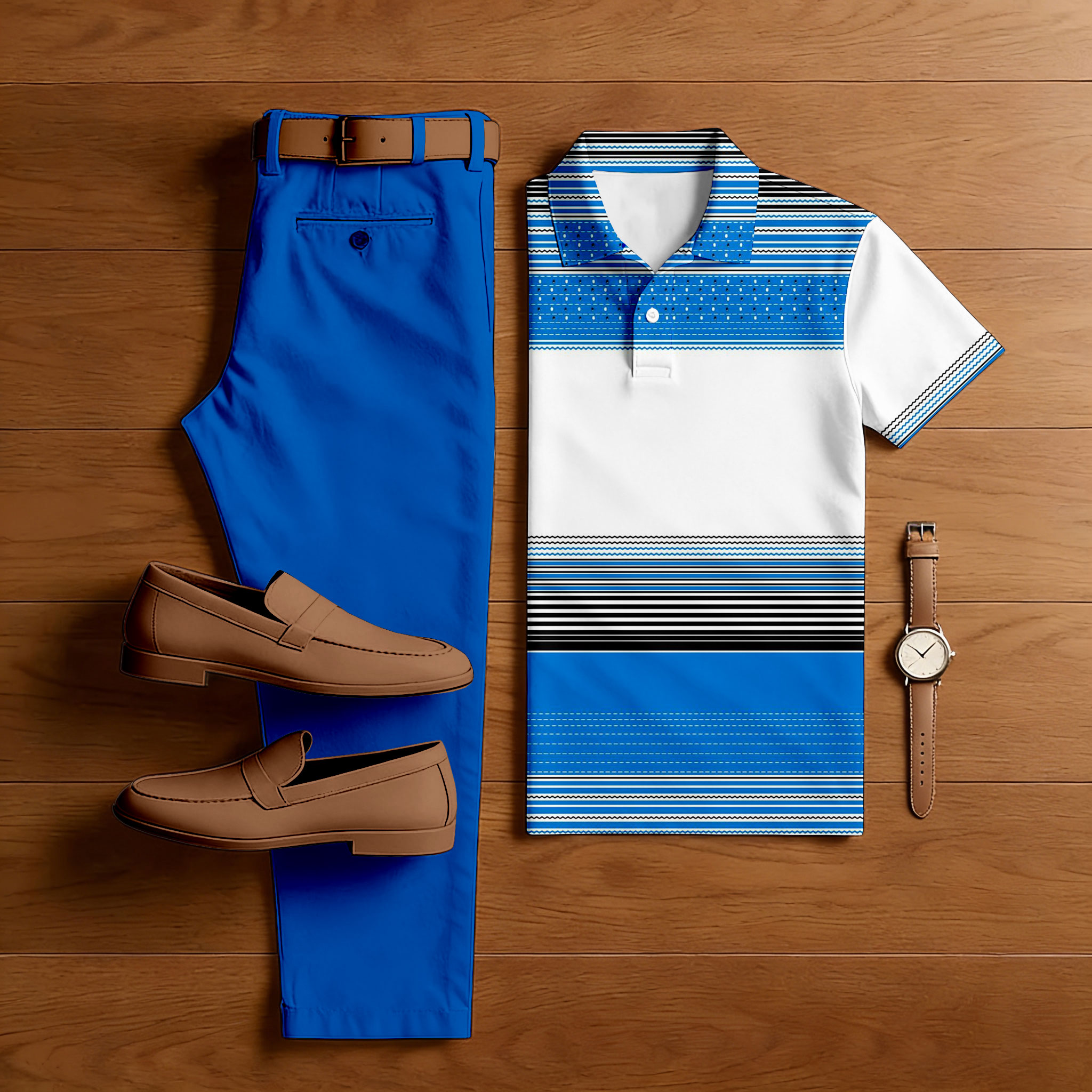 Men's Casual Royal Blue & White Color Matching Printed Short Sleeved Polo Shirt & Trousers Two-Piece Set