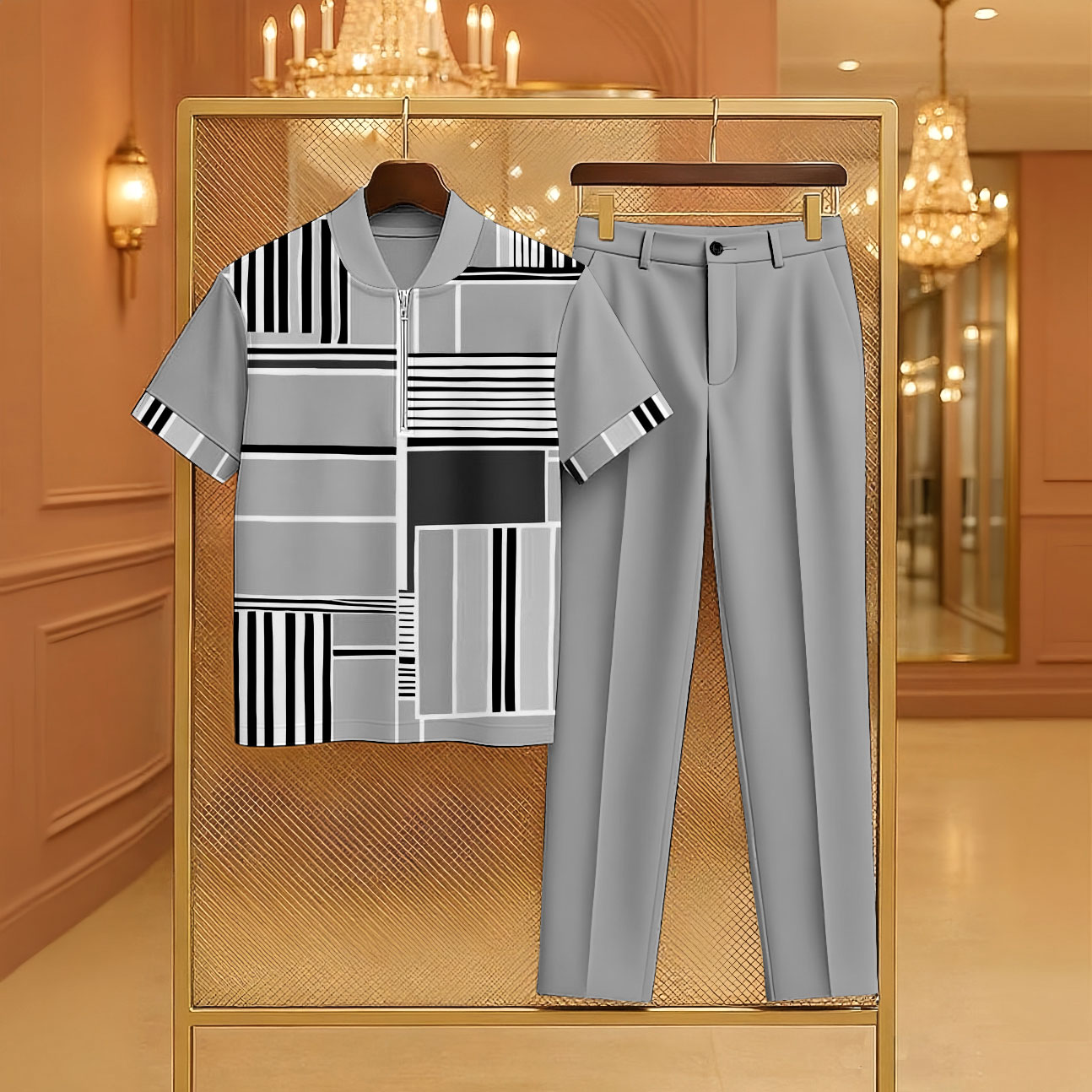 Men's Casual Gray & Khaki Color Matching Geometric Printed Short Sleeved Polo Shirt & Trousers Two-Piece Set