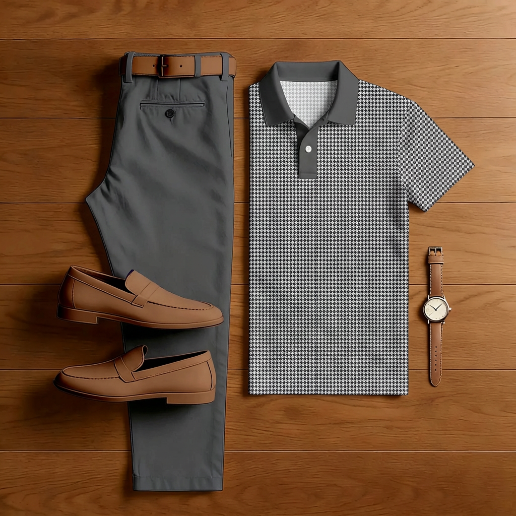 Men's Casual Gray Plaid Print Polo Shirt And Trousers Two-Piece Set