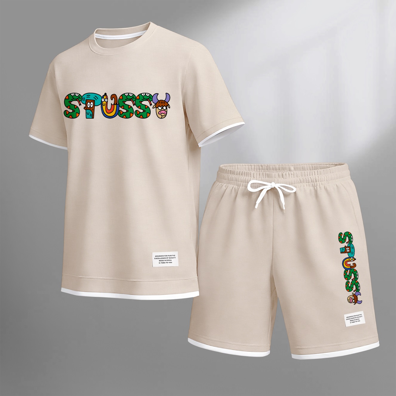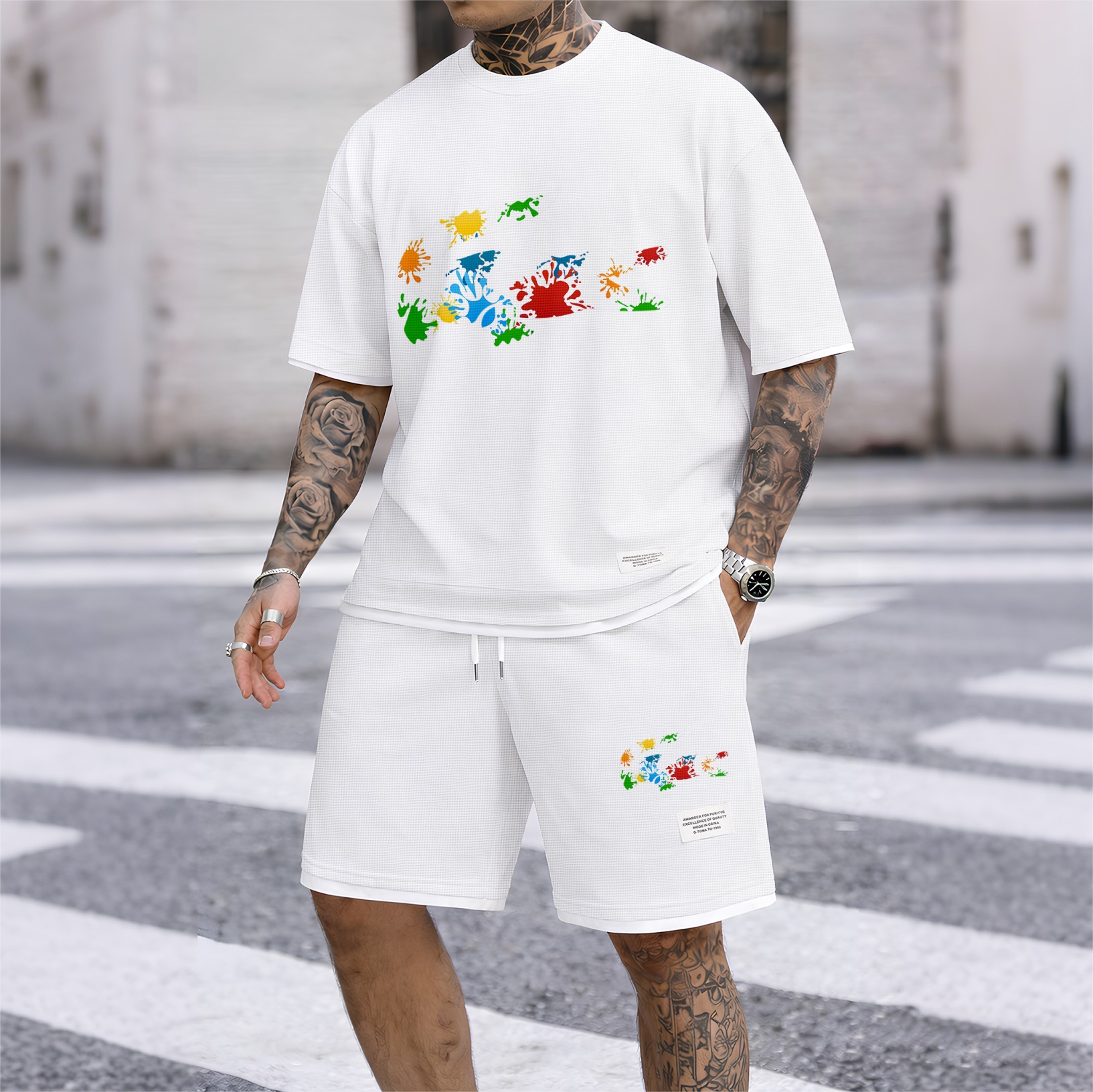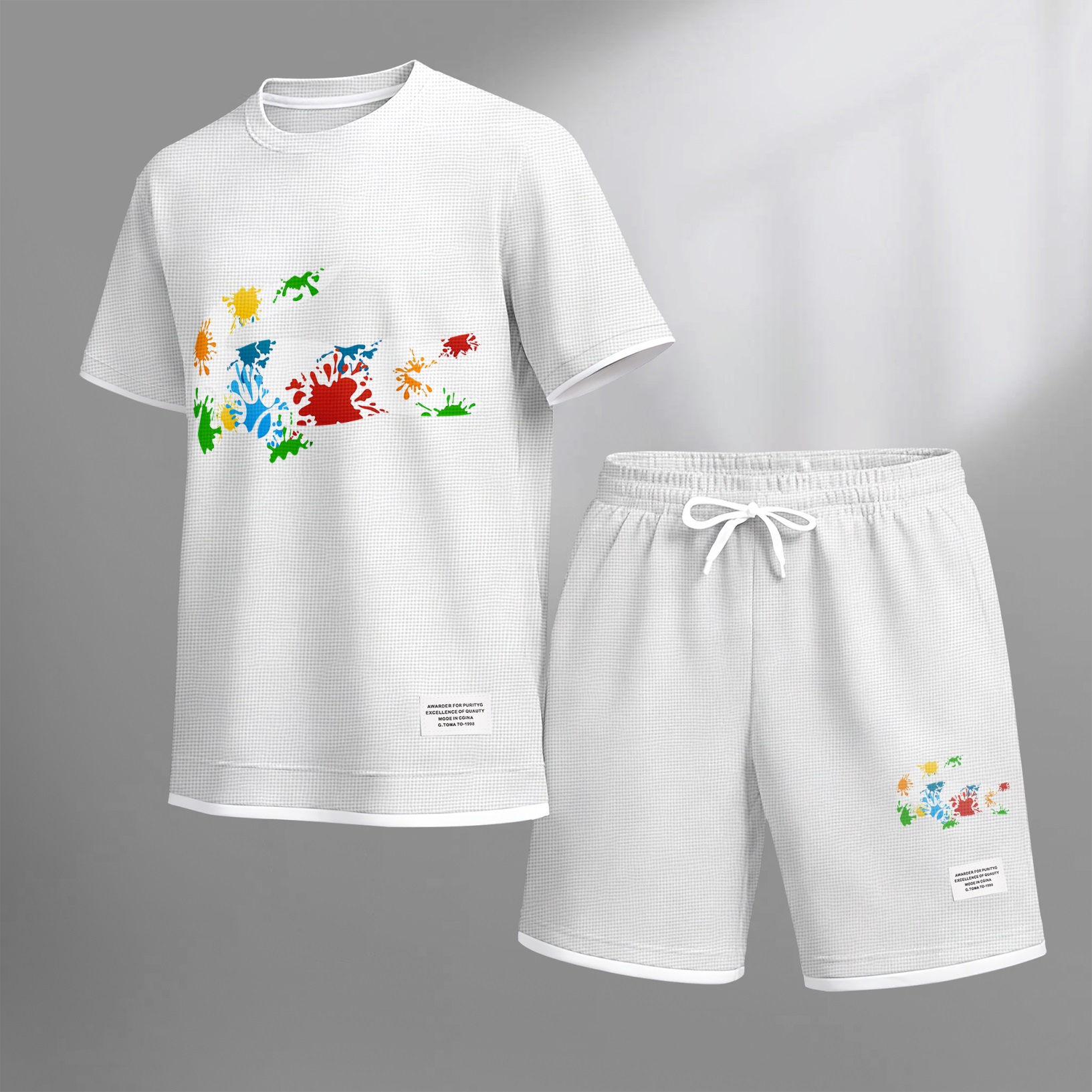 Men's Graffiti Collage Design Print Waffle Fabric Short-Sleeved Shirt And Shorts Set