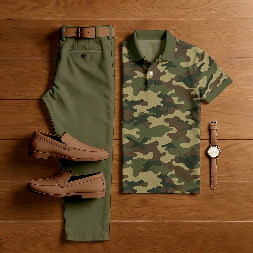 Men's Casual Army Green & Khaki Color Matching Striped Printed Short Sleeved Polo Shirt & Trousers Two-Piece Set