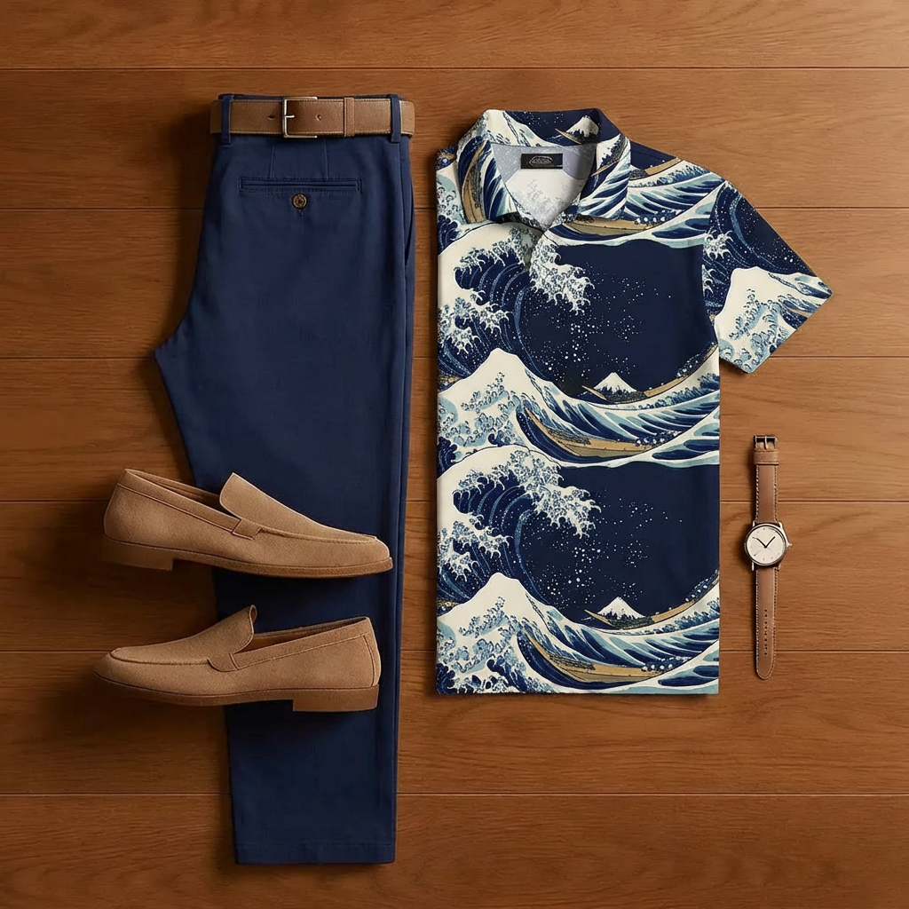 Men's Casual Dark Blue Color-Blocked Printed Short-Sleeved Shirt And Trousers Two-Piece Set