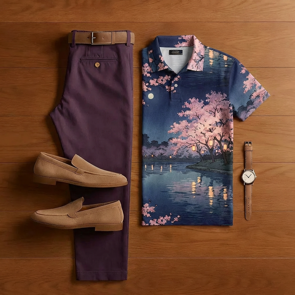 Men's Casual Apricot Maple Leaf Print Polo Shirt And Trousers Two-Piece Set