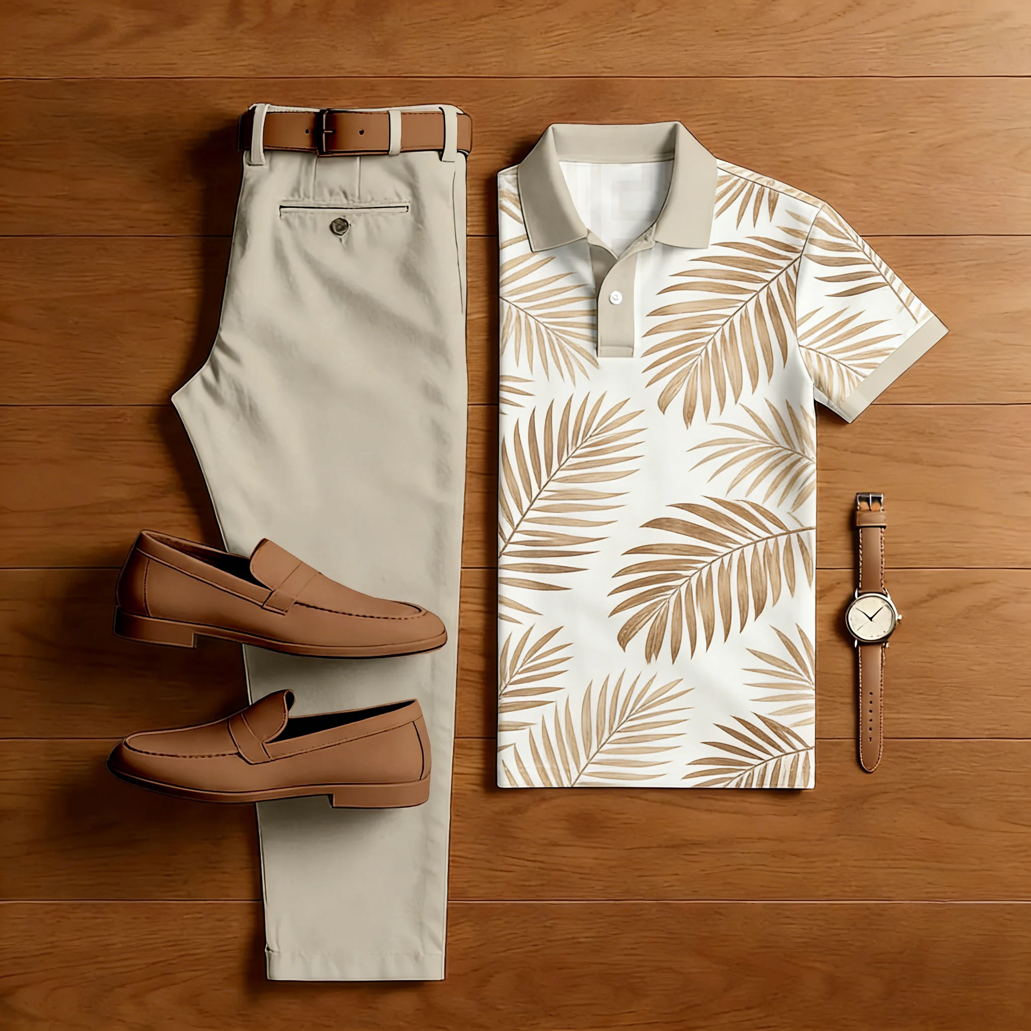 Men's Casual Brown & Khaki Color Matching Art Printed Short Sleeved Polo Shirt & Trousers Two-Piece Set