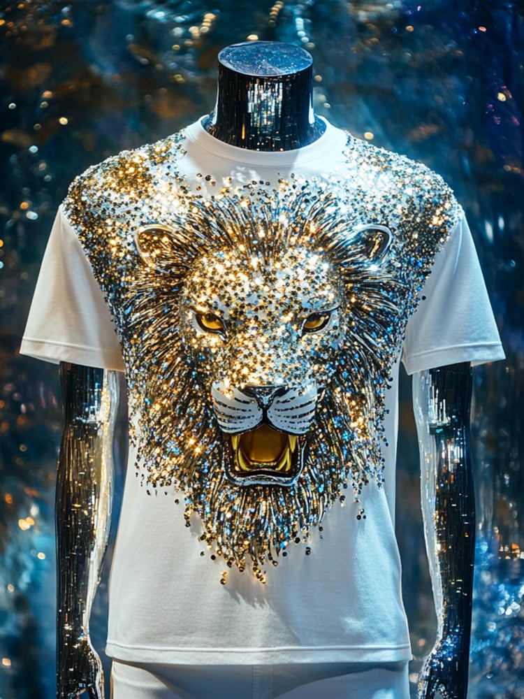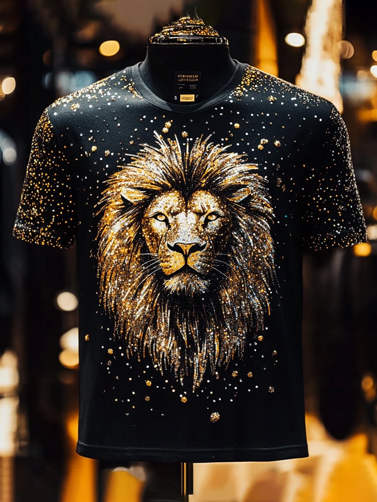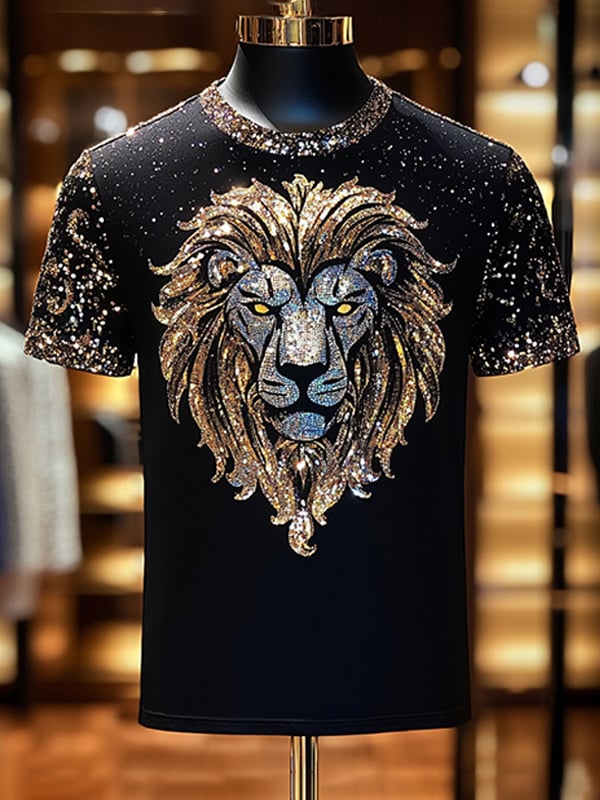 Men's Lion Sequin Business Print Short Sleeve T-Shirt