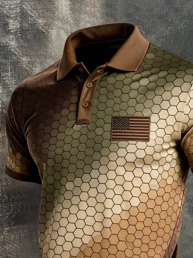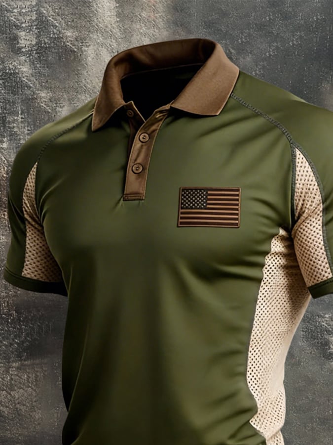 Men's Retro Spliced Breathable Mesh "Patriot" Polo-Collar Casual T-Shirt