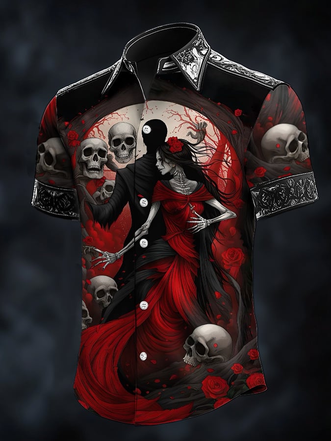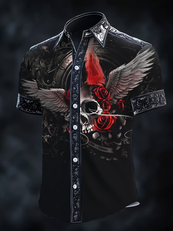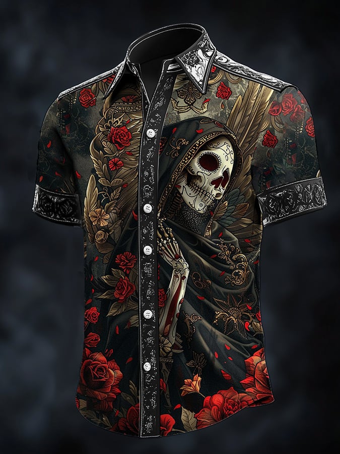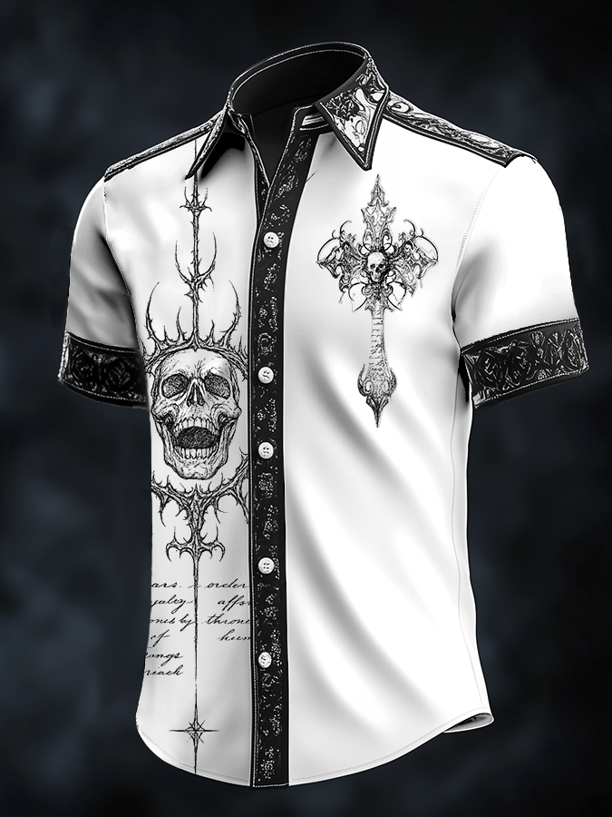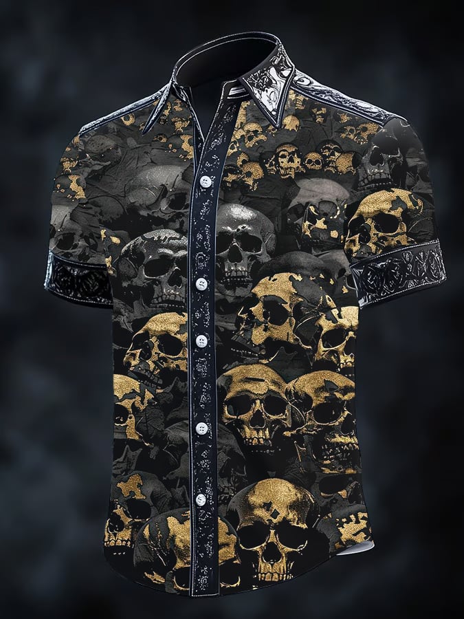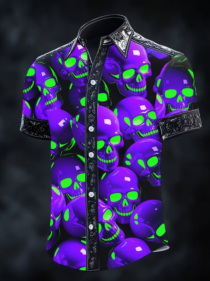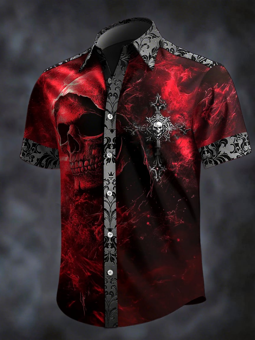 Men's Retro Horror Skull Print Lapel Short Sleeve Shirt