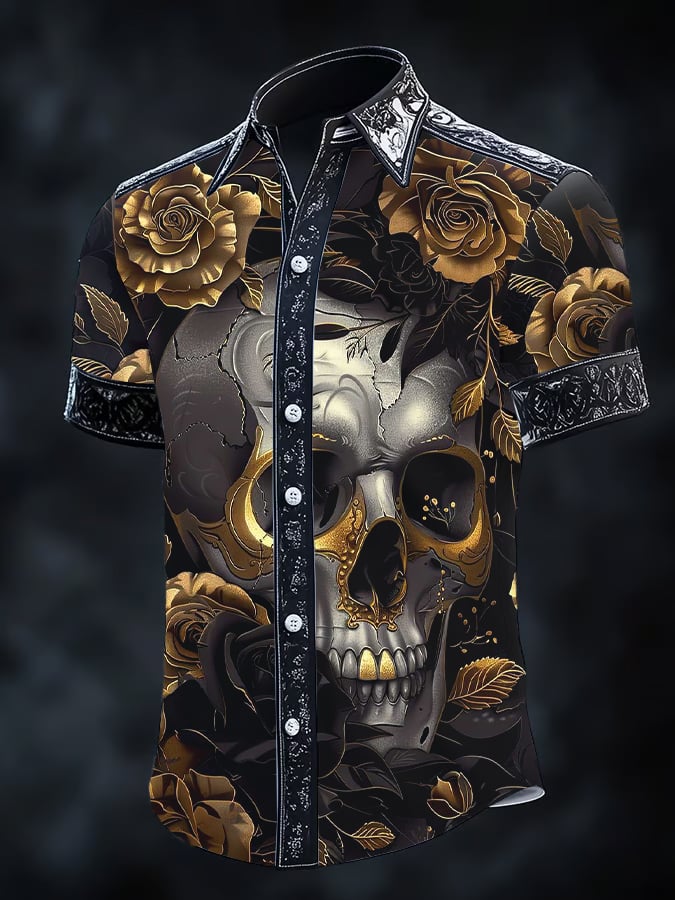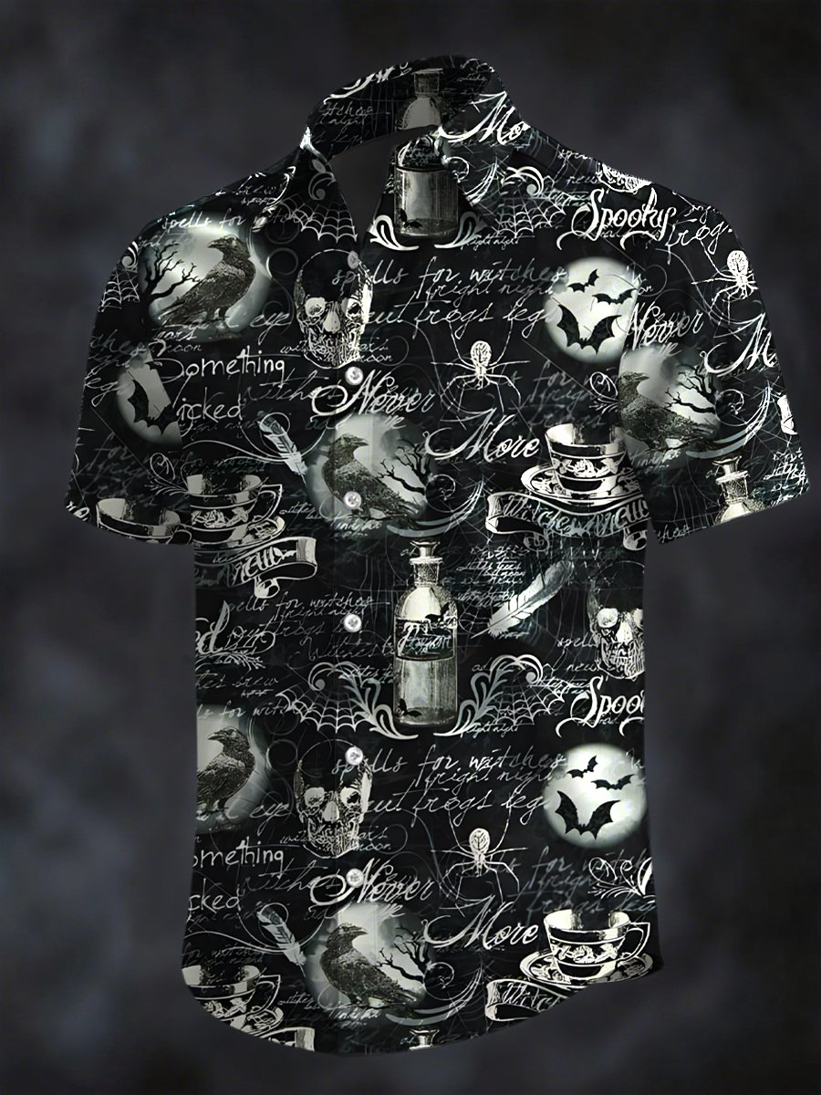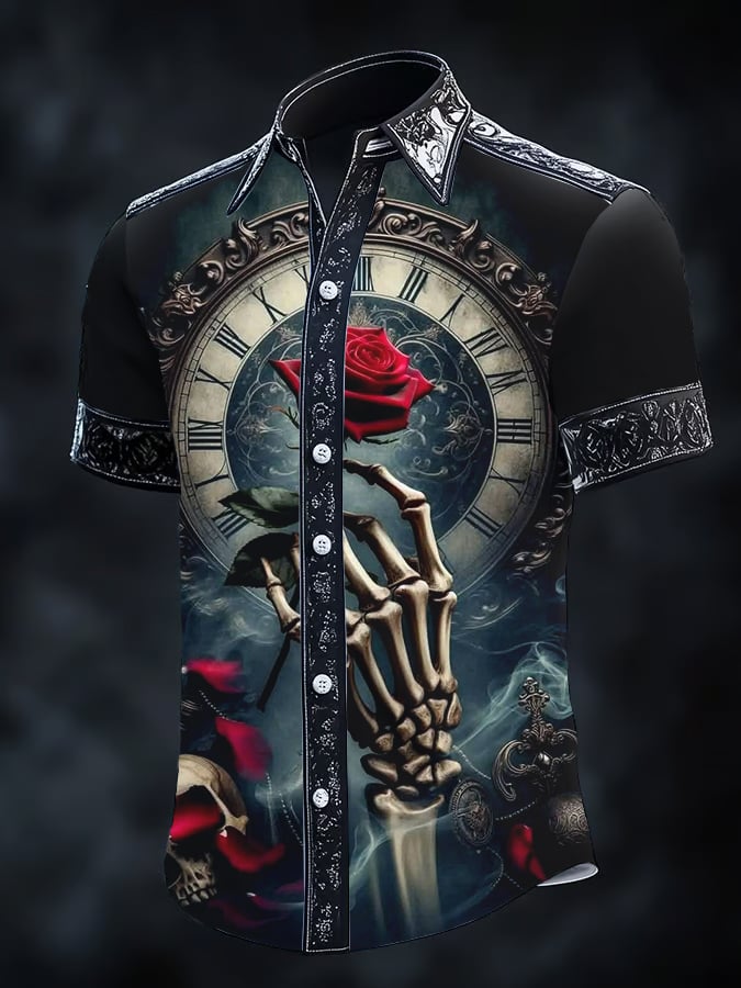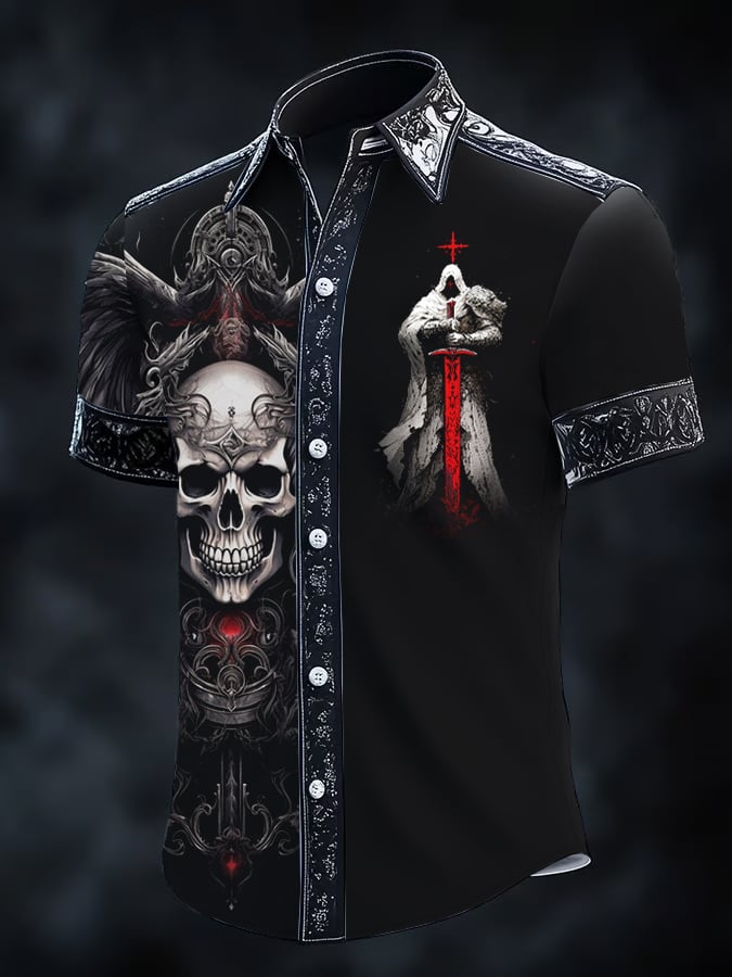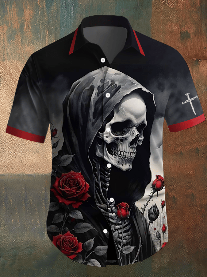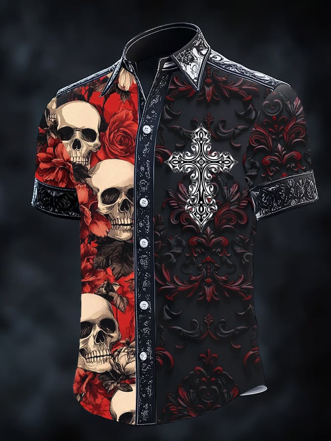 Men's Retro Horror Skull Print Lapel Short Sleeve Shirt