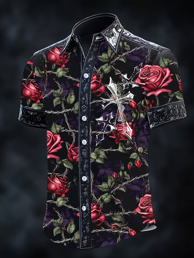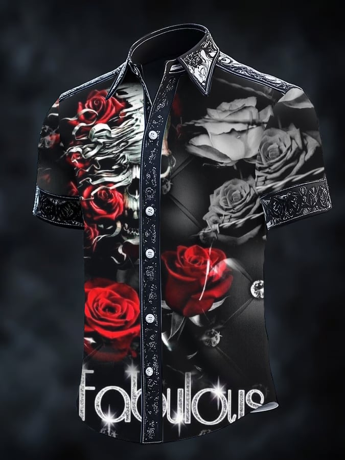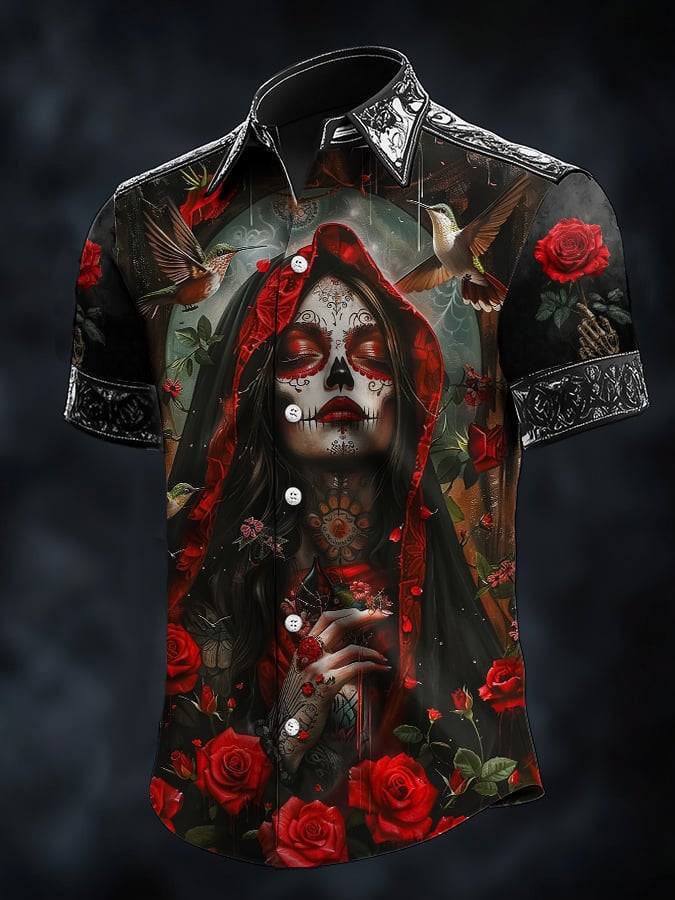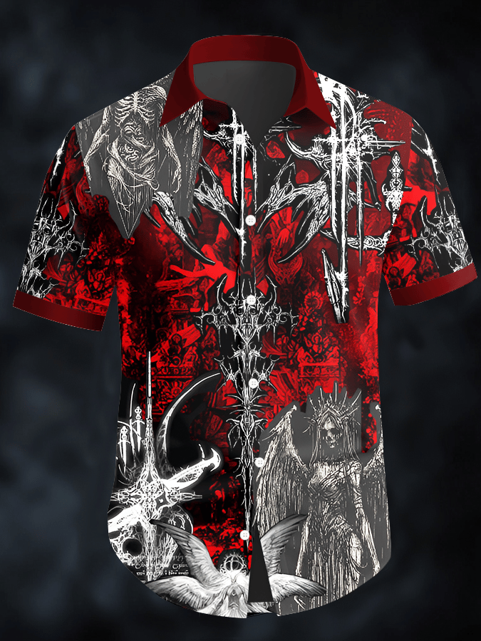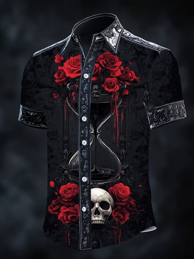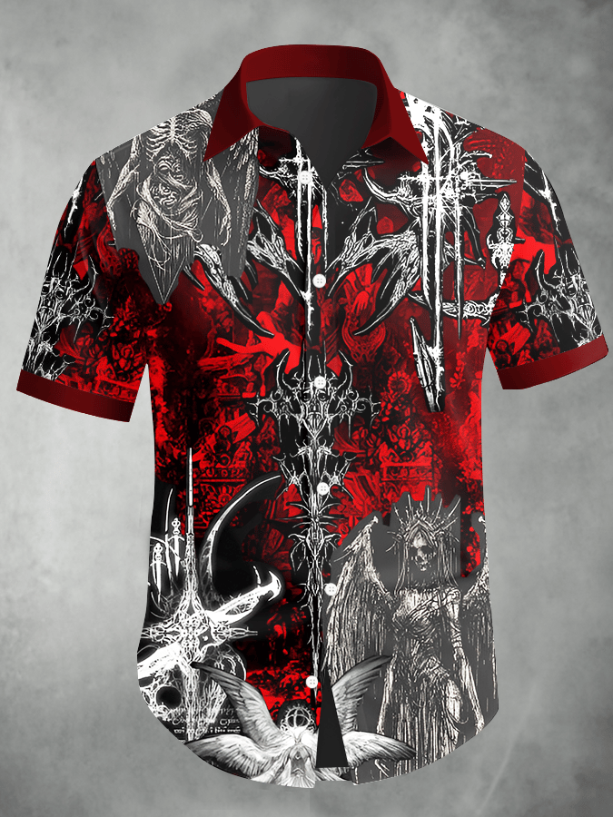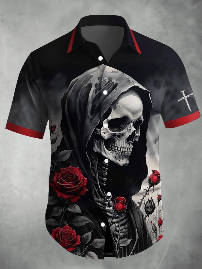 Men's Retro Horror Skull Print Lapel Short Sleeve Shirt