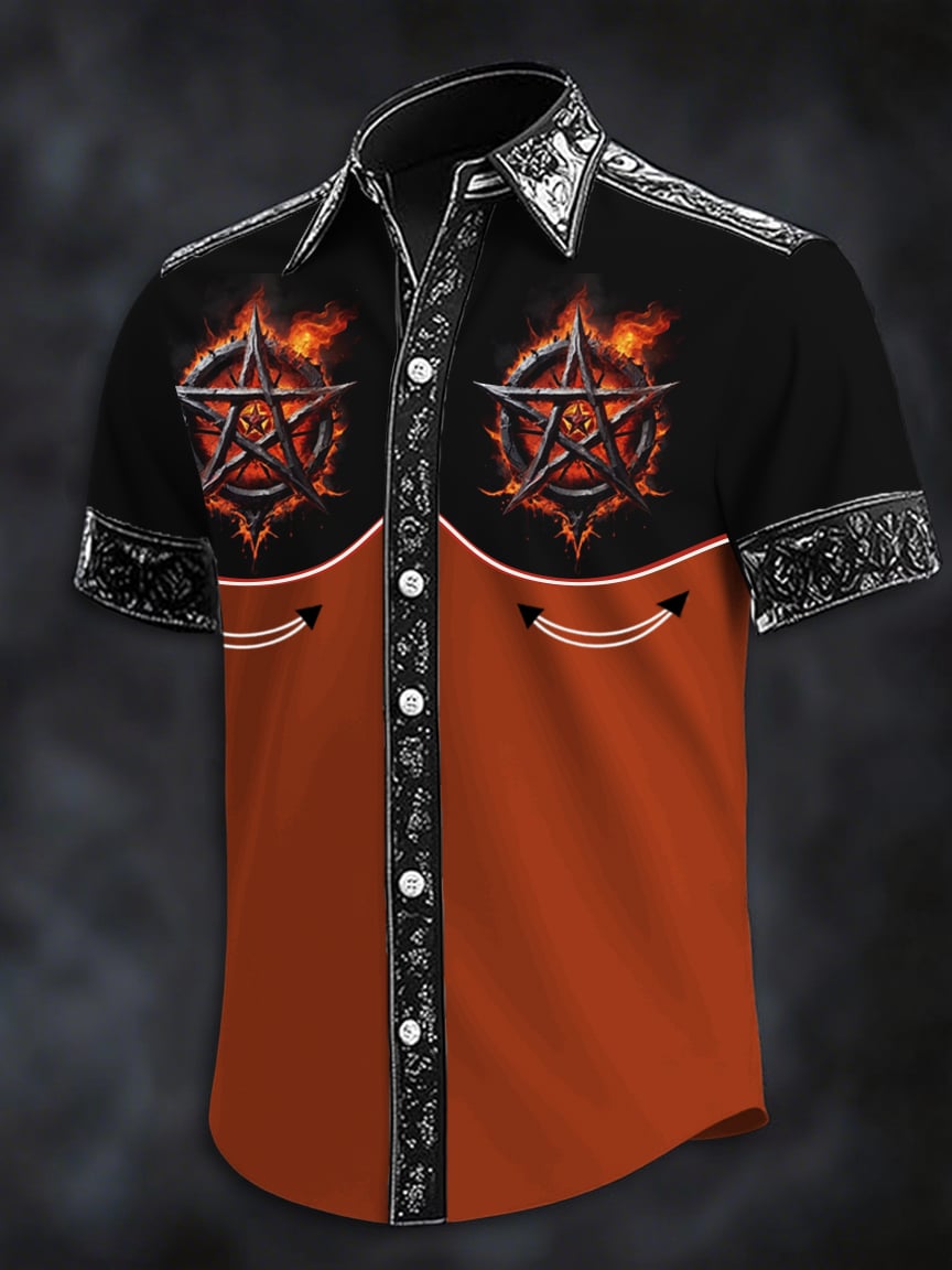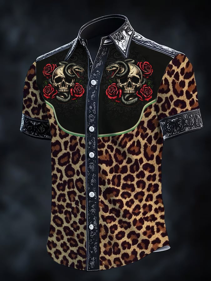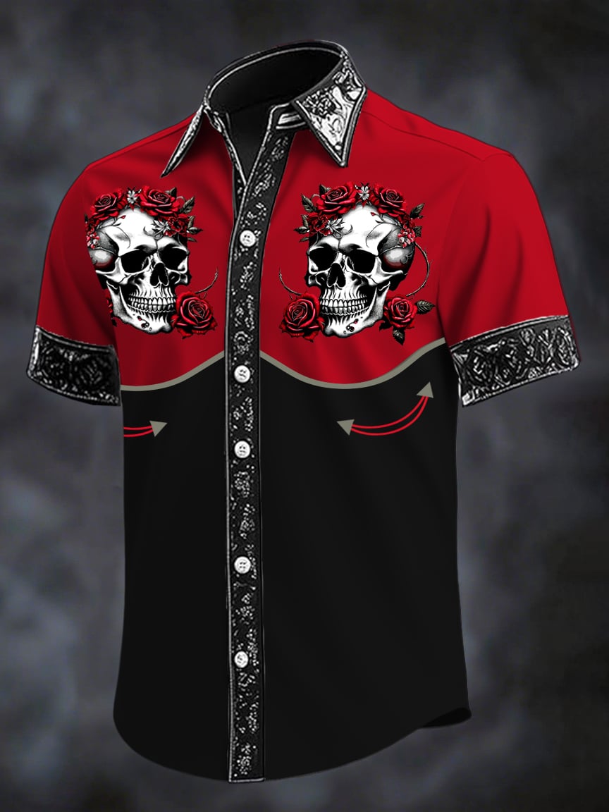 Men's Retro Western Skull and Heart Print Short Sleeve Shirt
