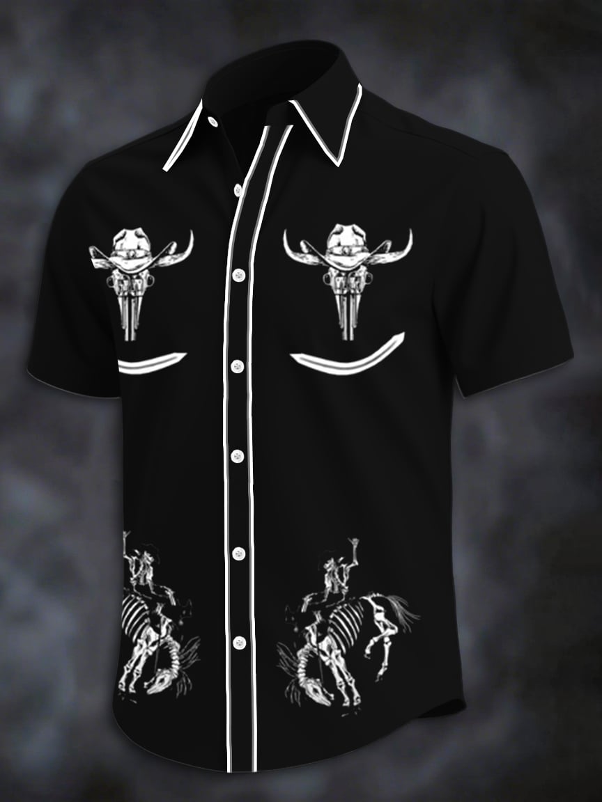 Men's Retro Western Skull Vine Print Short Sleeve Shirt