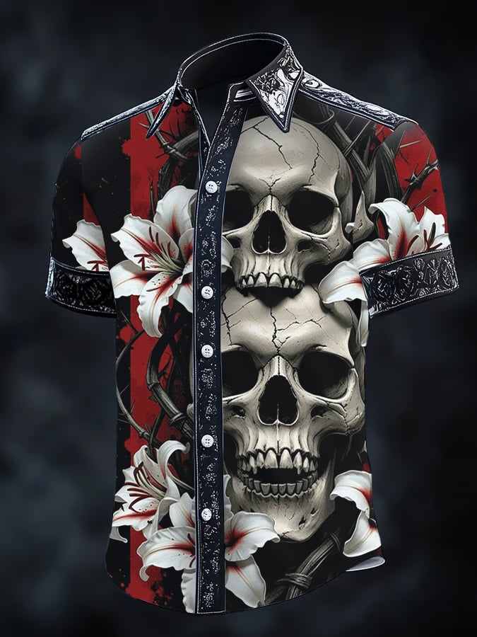 Men's Vintage Skull and Floral Short Sleeve Shirt