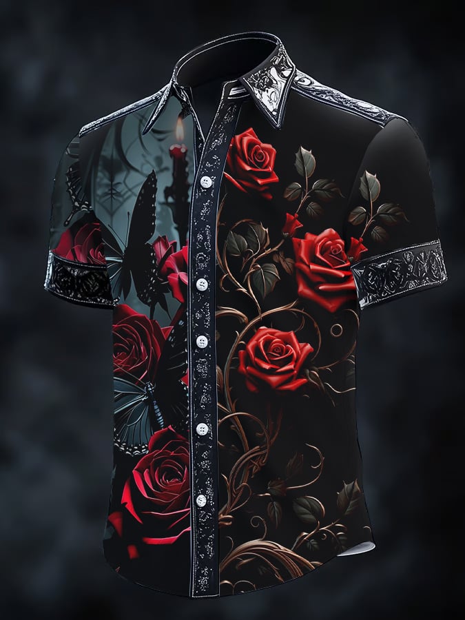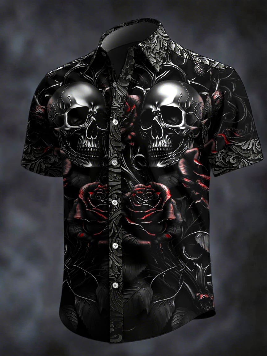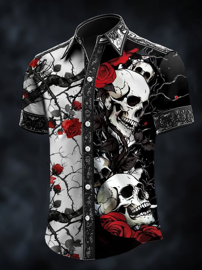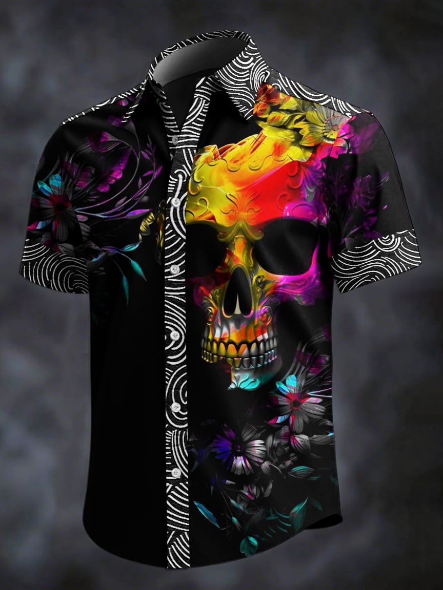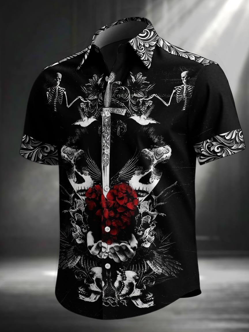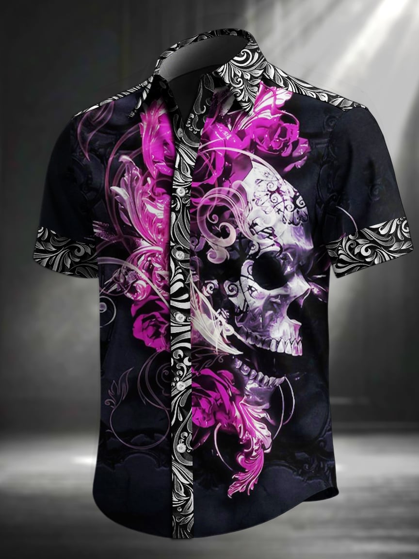 Men's Vintage Skull Floral Print Lapel Short Sleeve Shirt
