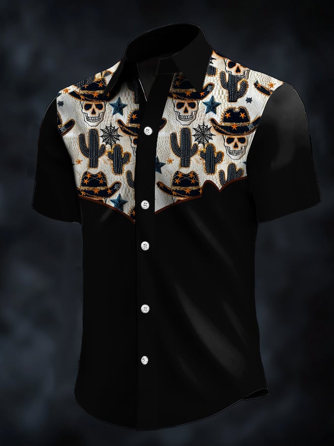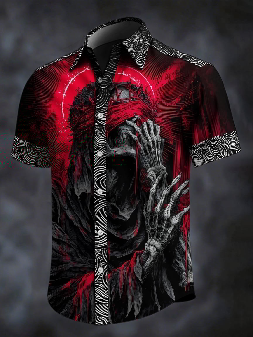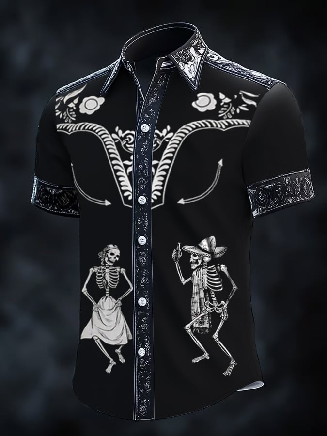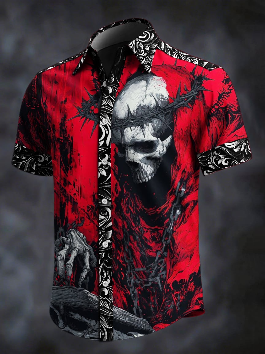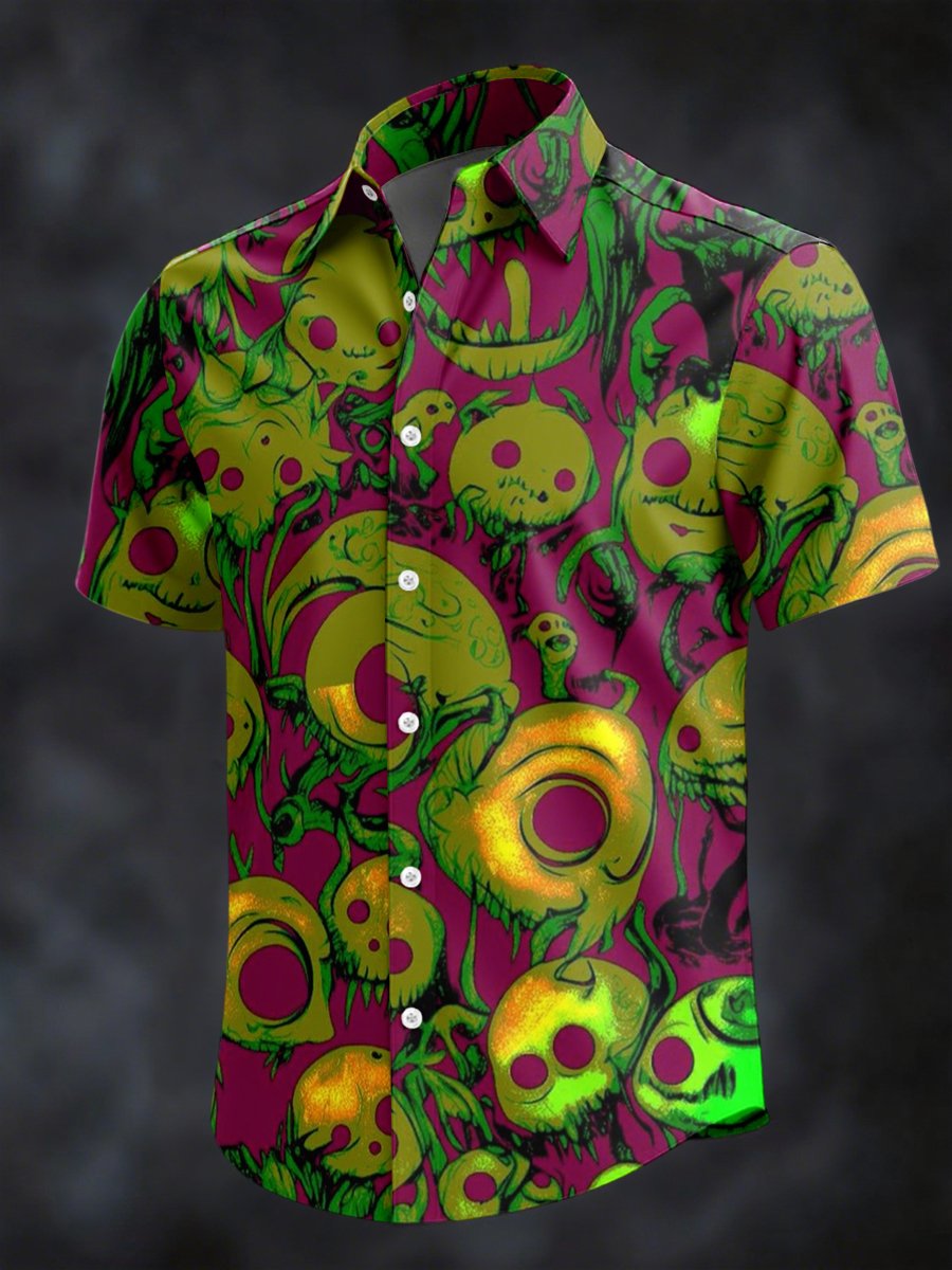 Men's Retro Horror Skull Print Lapel Short Sleeve Shirt