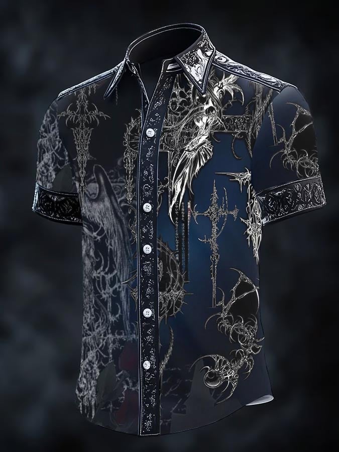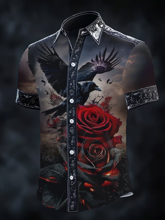 Men's Casual Fashion Dark Pattern Cross Crow Contrast Satin Shirt