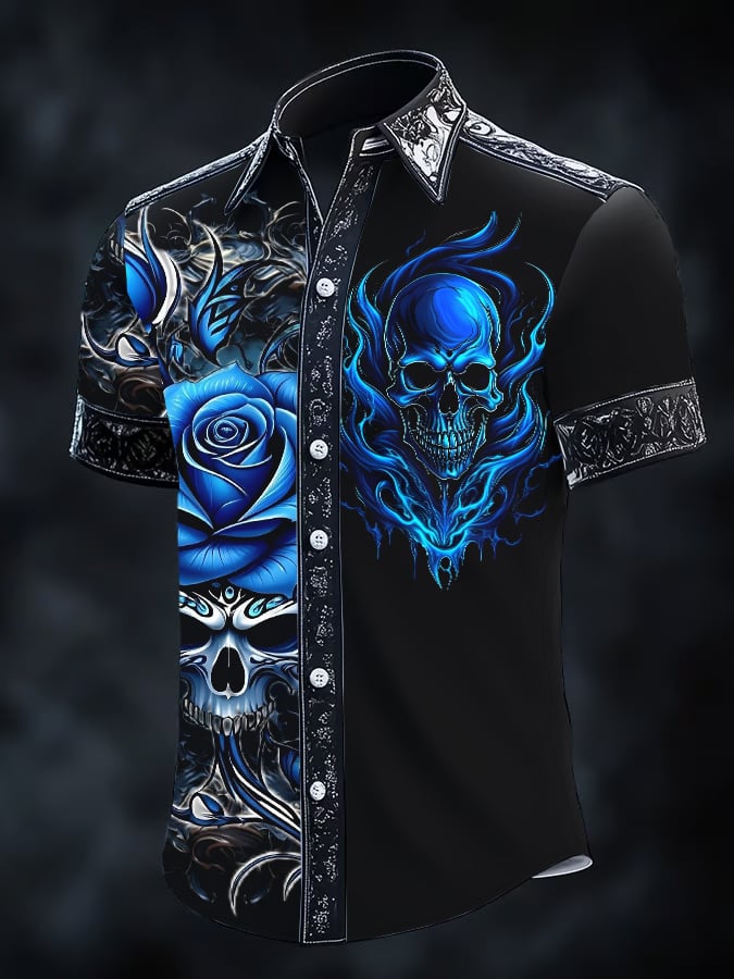 Men's Retro Skull Print Lapel Short Sleeve Shirt