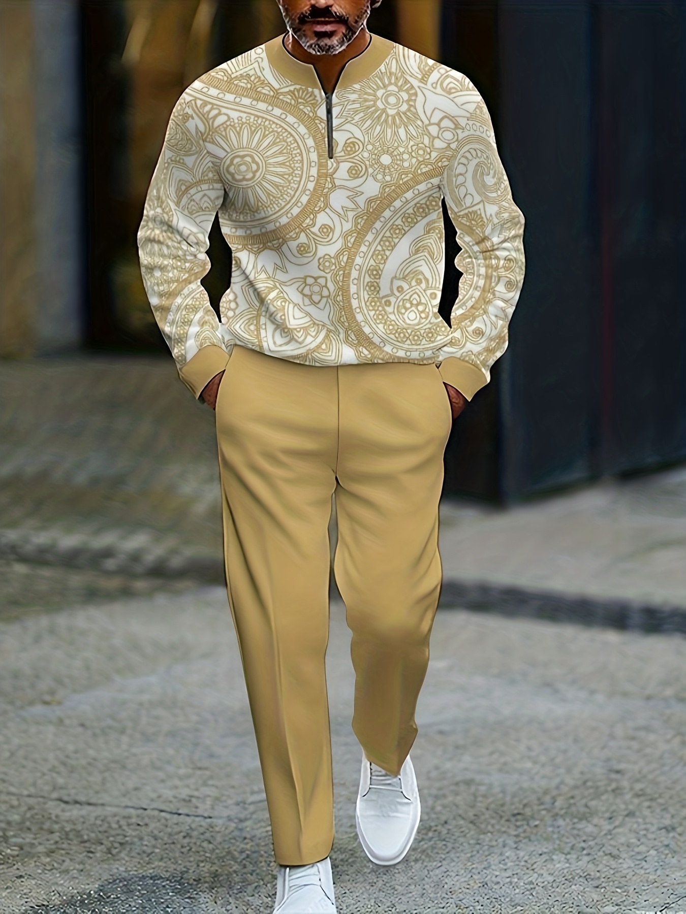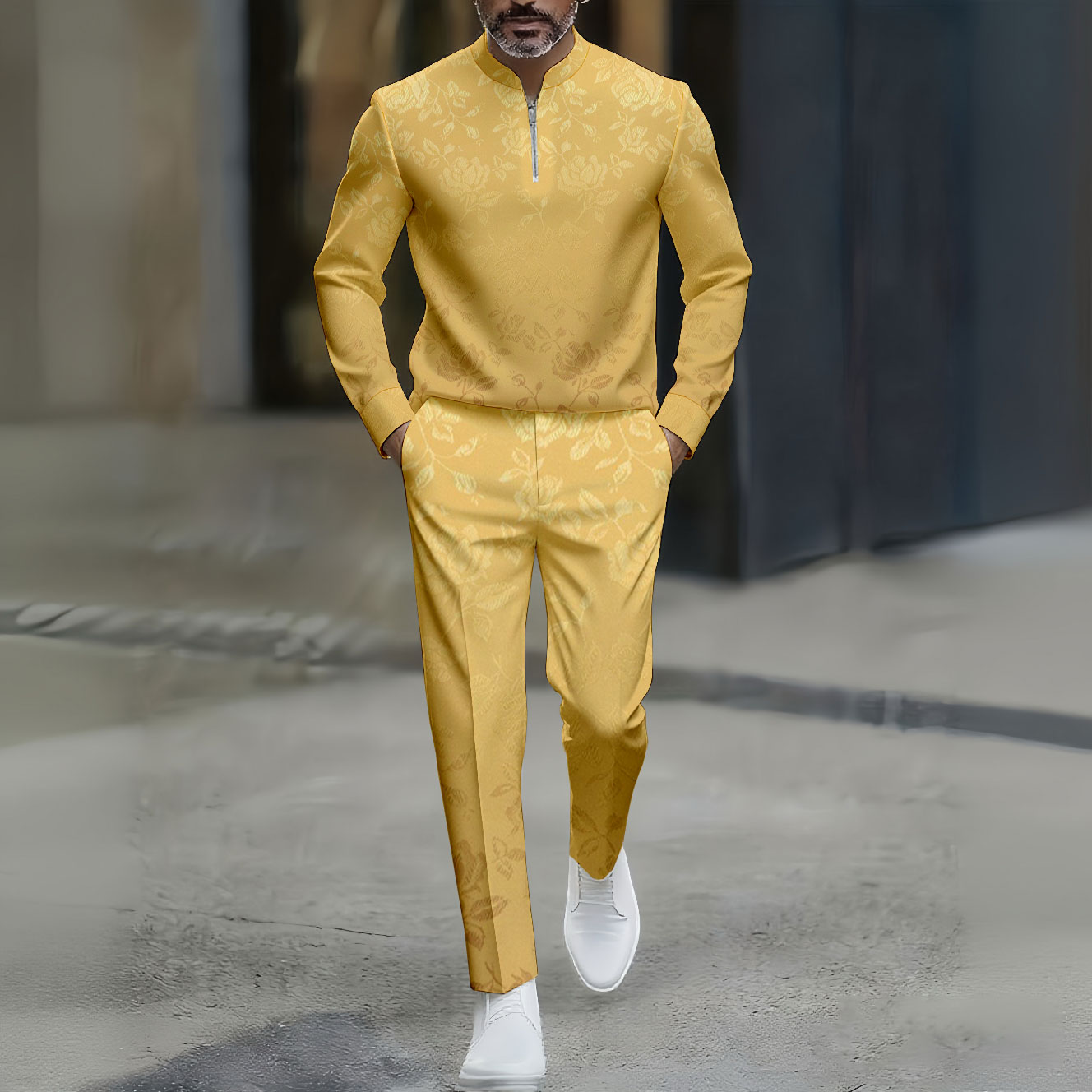 Men's Casual Flower Printed Round-Neck Zipper Long Sleeved Trousers Yellow Two-Piece Set