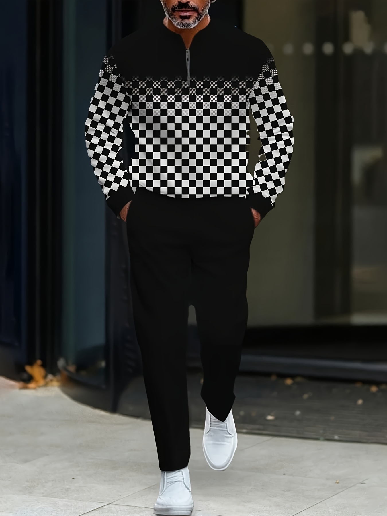 Men's Casual Black White Checked Printed Round-Neck Zipper Long Sleeved Trousers Two-Piece Set