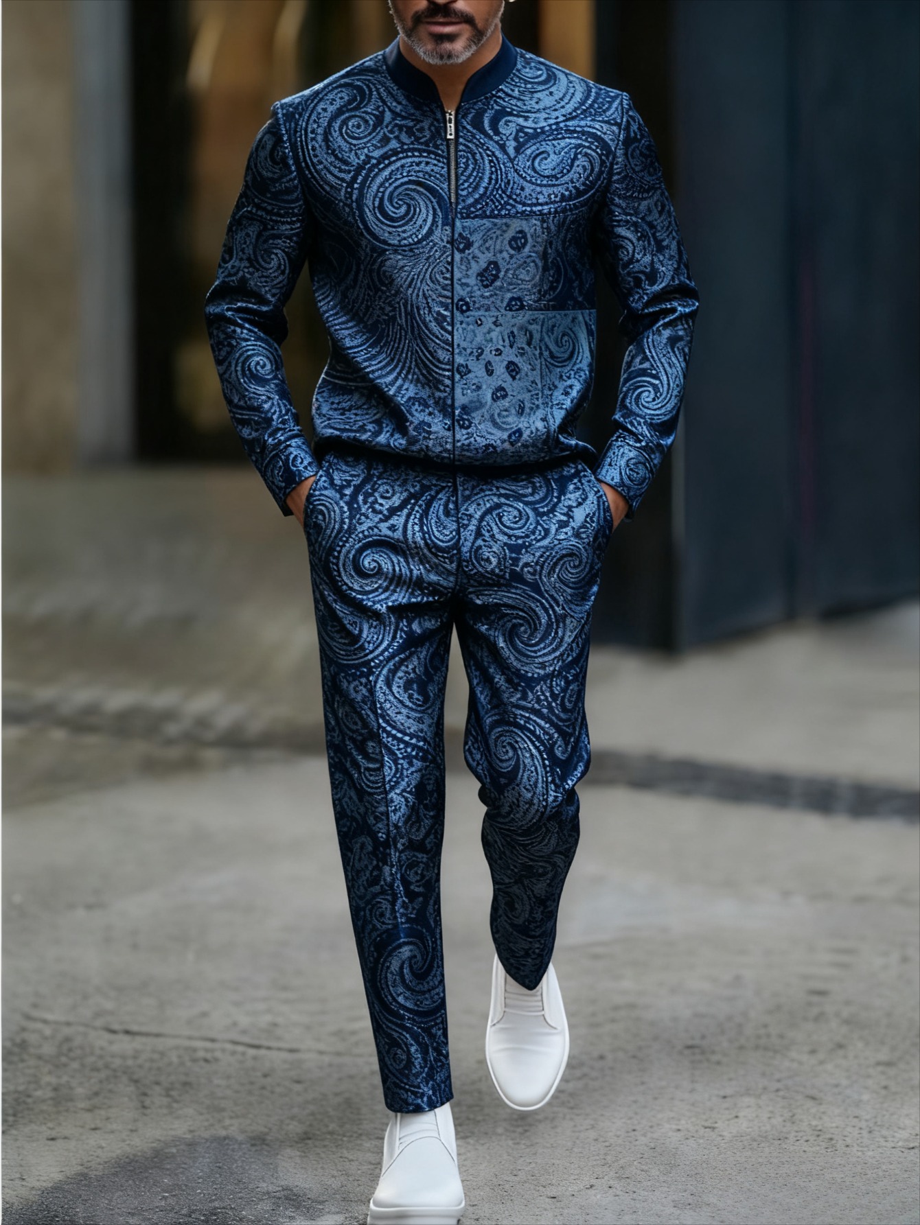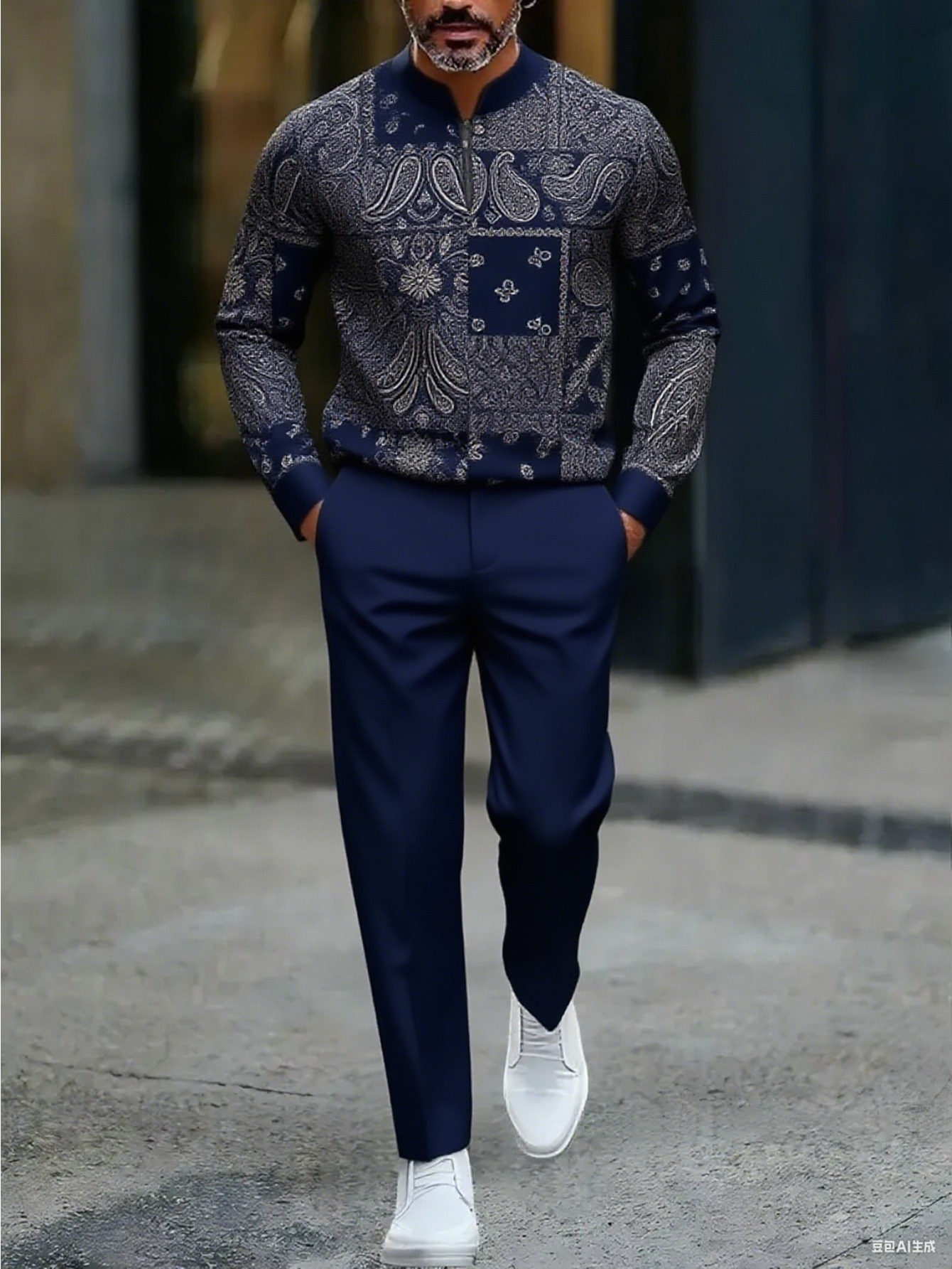 Men's Casual Ethnic Style Printed Round-Neck Zipper Long Sleeved Trousers Navy Blue Two-Piece Set