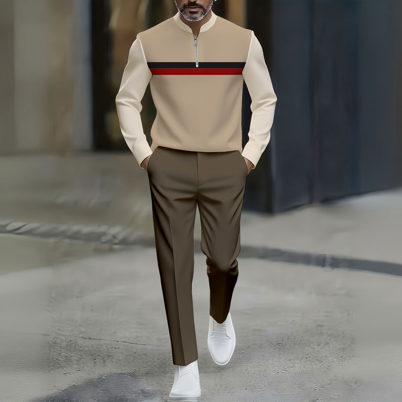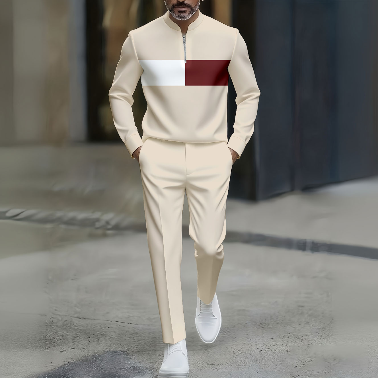 Men's Casual White & Maroon Color Matching Printed Round-Neck Zipper Long Sleeved Trousers Apricot Two-Piece Set
