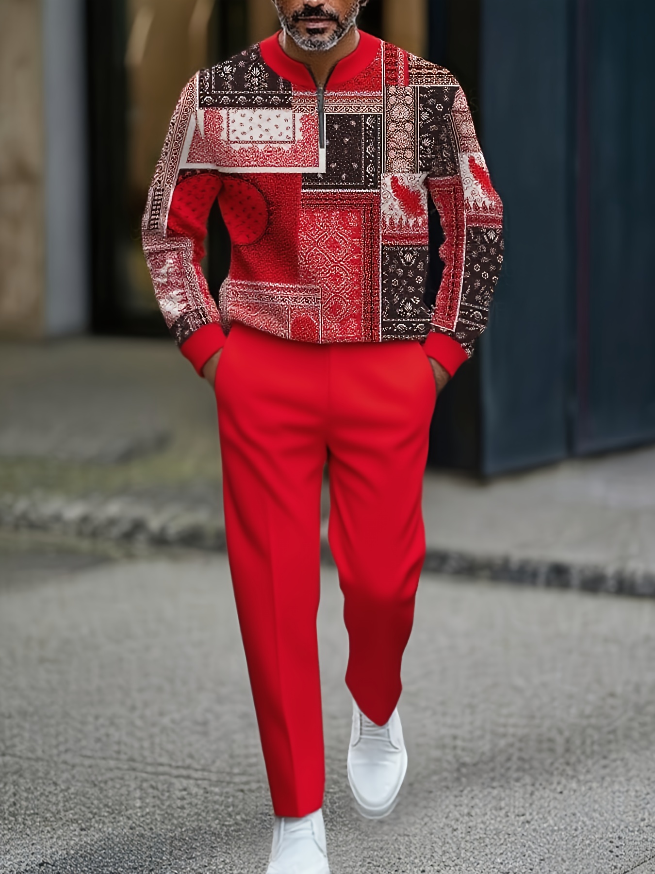 Men's Casual Color Matching Striped Printed Round-Neck Zipper Long Sleeved Trousers Red Two-Piece Set