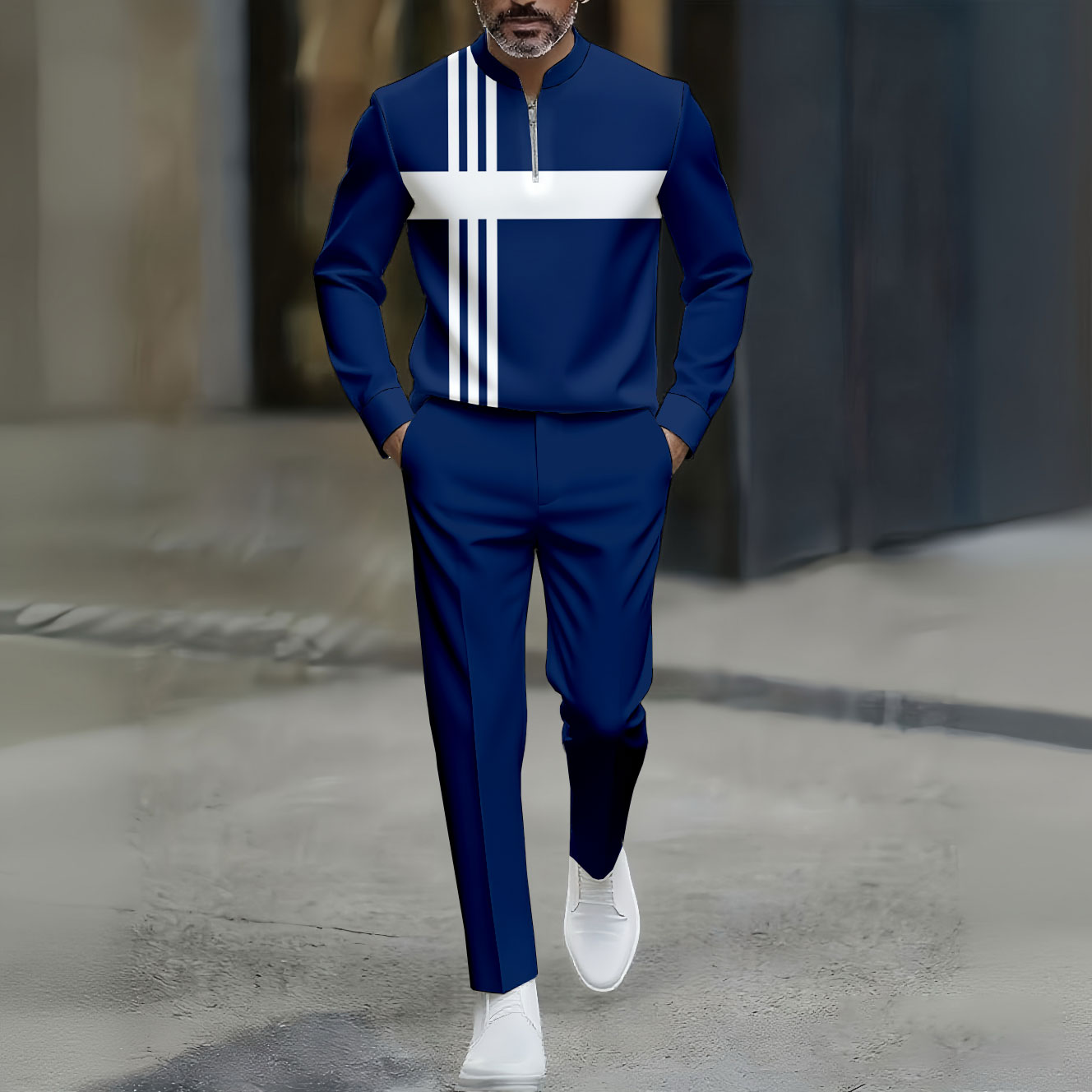Men's Casual Color Matching Striped Printed Round-Neck Zipper Long Sleeved Navy Blue Trousers Two-Piece Set